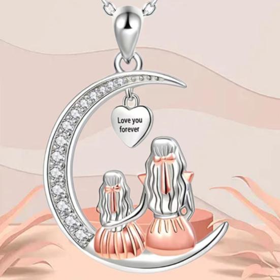 Это изысканное ожерелье имеет удлиненные цепочки, что позволяет регулировать длину, подходящую большинству людей.. Украшенный искренней надписью «Люблю тебя вечно», он станет трогательным подарком для матерей.. Дизайн демонстрирует очаровательный мотив матери и дочери, сидящих на полумесяце..