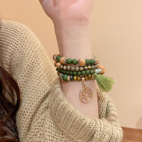 Универсальный стиль: Легко улучшите свой образ с этим набором из 4 эластичных браслетов в стиле бохо с разноцветными деревянными бусинами и кисточками.. Простой, но элегантный дизайн дополнит любую прическу и наряд, что делает его идеальным для того, чтобы поделиться им с семьей, друзьями или любимым человеком.