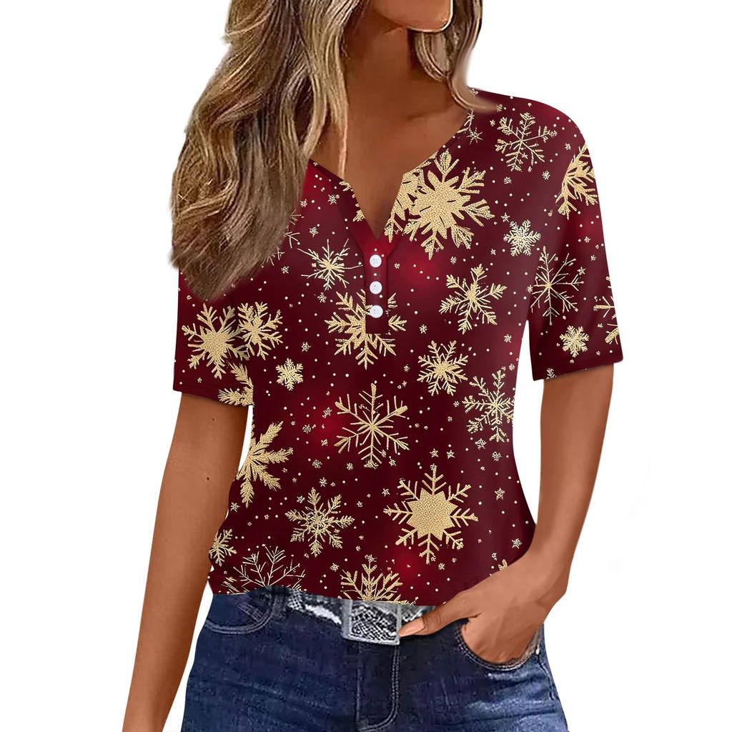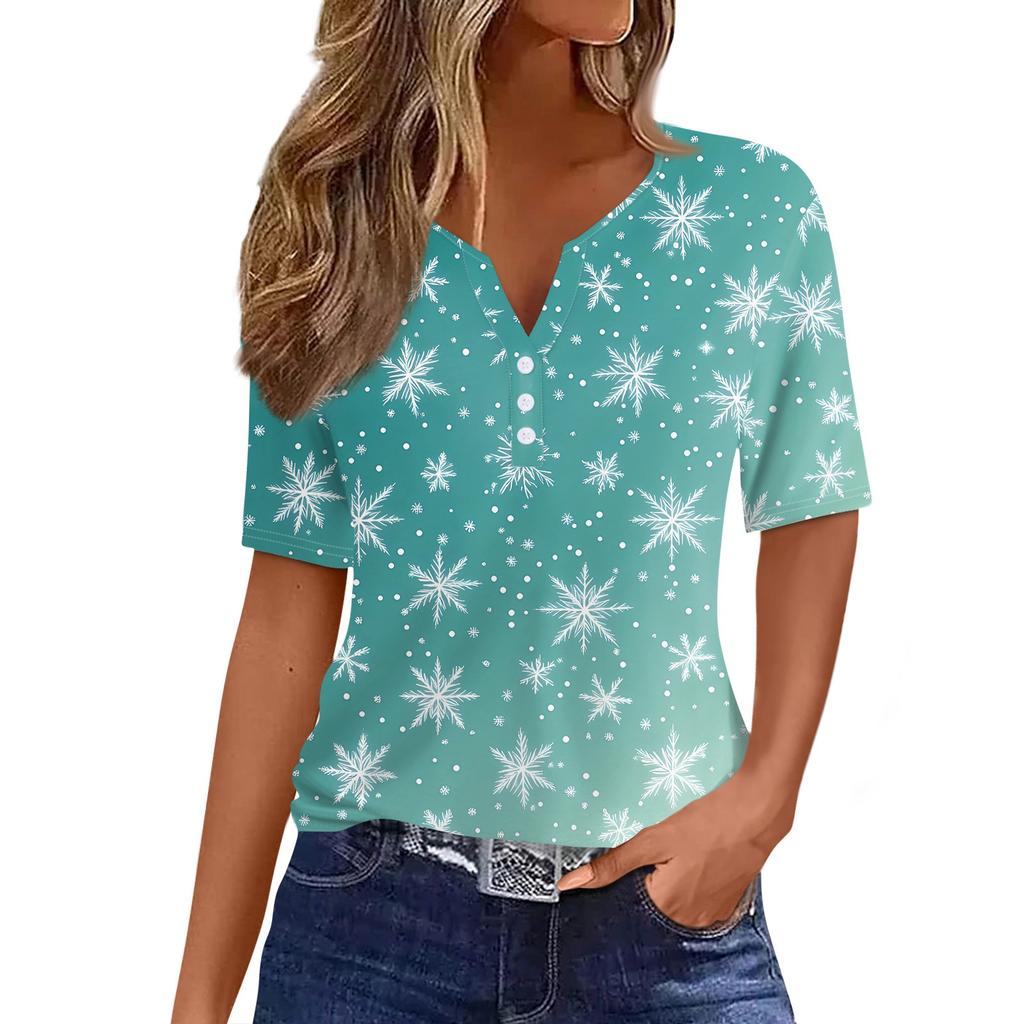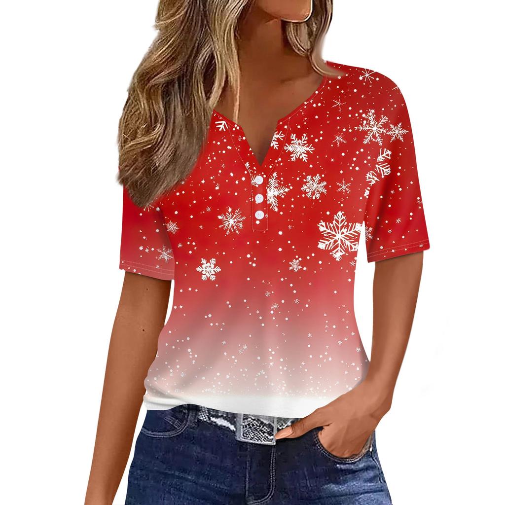 Женская футболка с рождественским принтом, на пуговицах, с коротким рукавом, повседневная, для выходных, модная, базовая, с V-образным вырезом, обычная