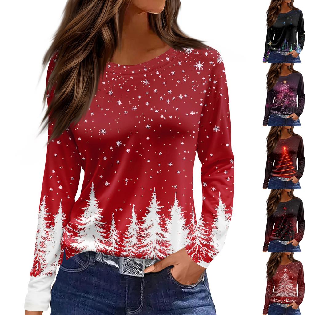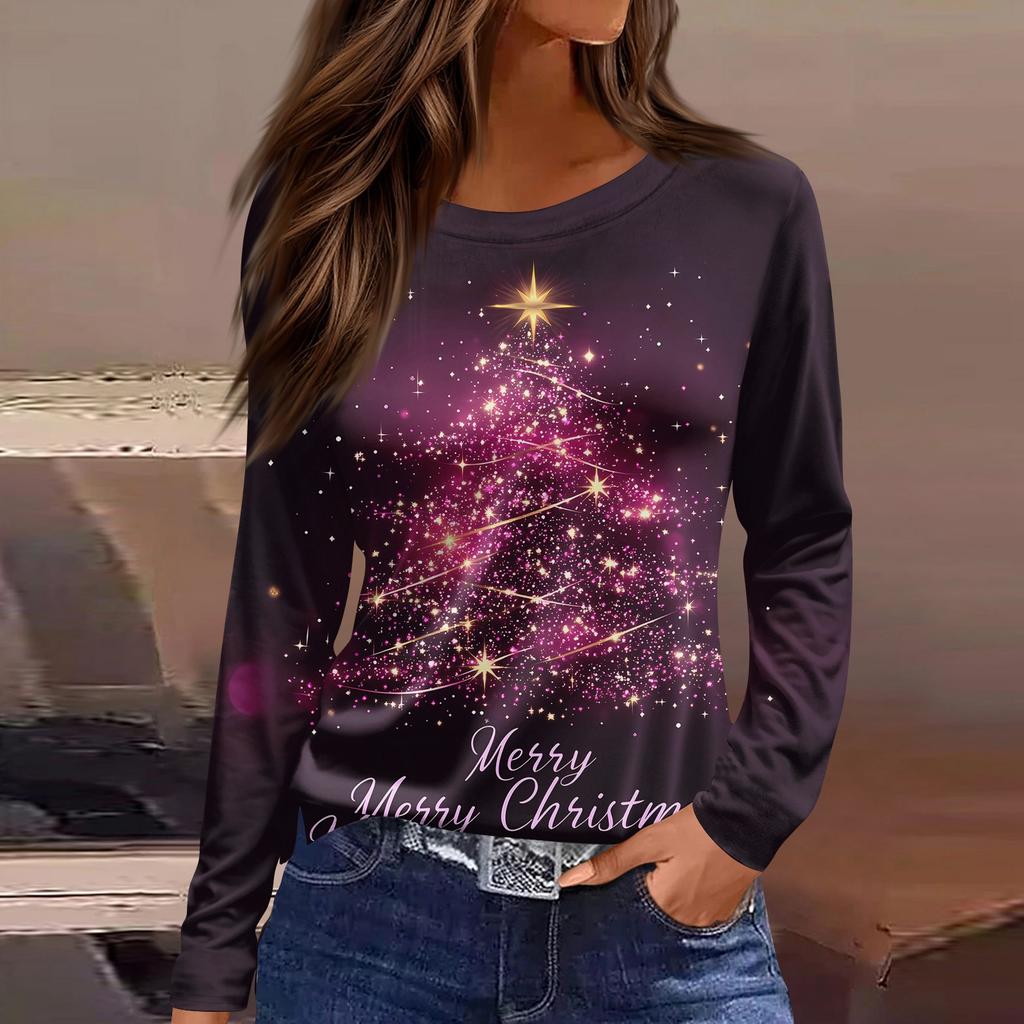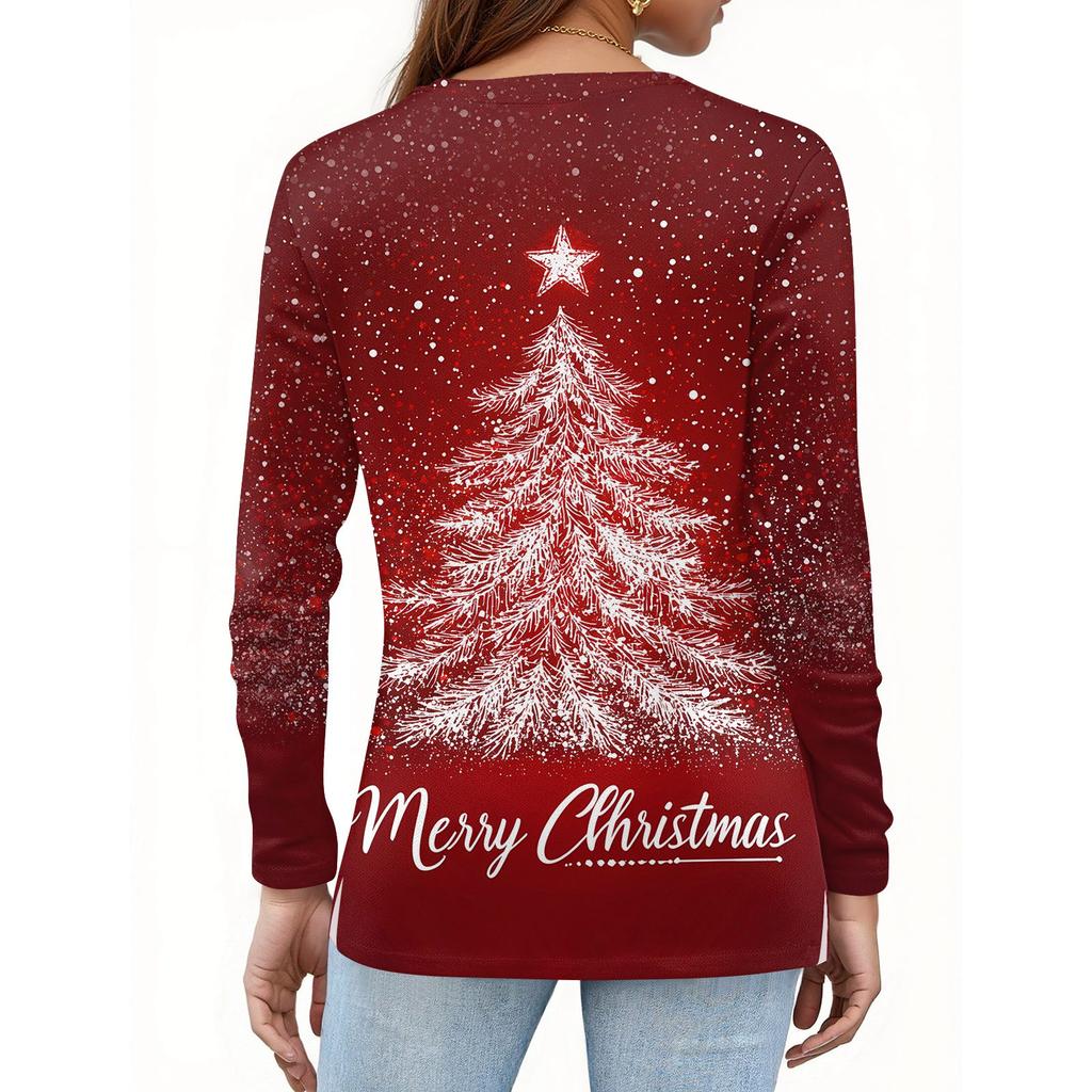 Женская модная повседневная футболка с разрезом по низу, круглым вырезом, длинными рукавами, свободного кроя, с рождественским принтом, женский топ