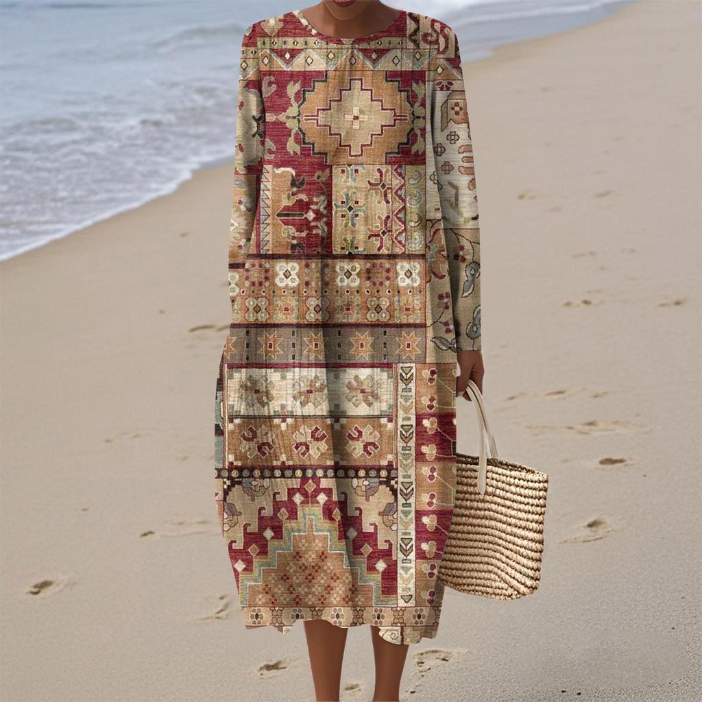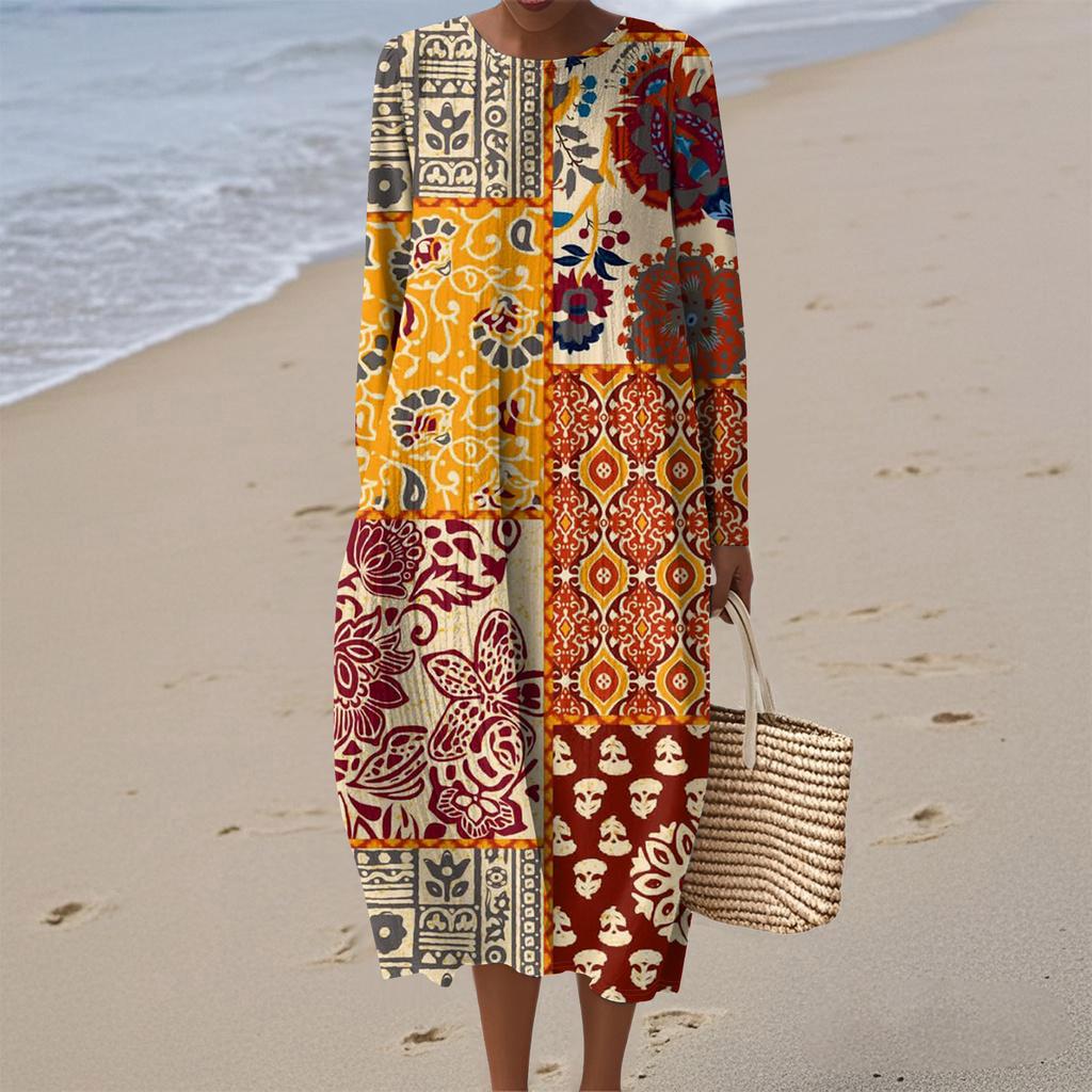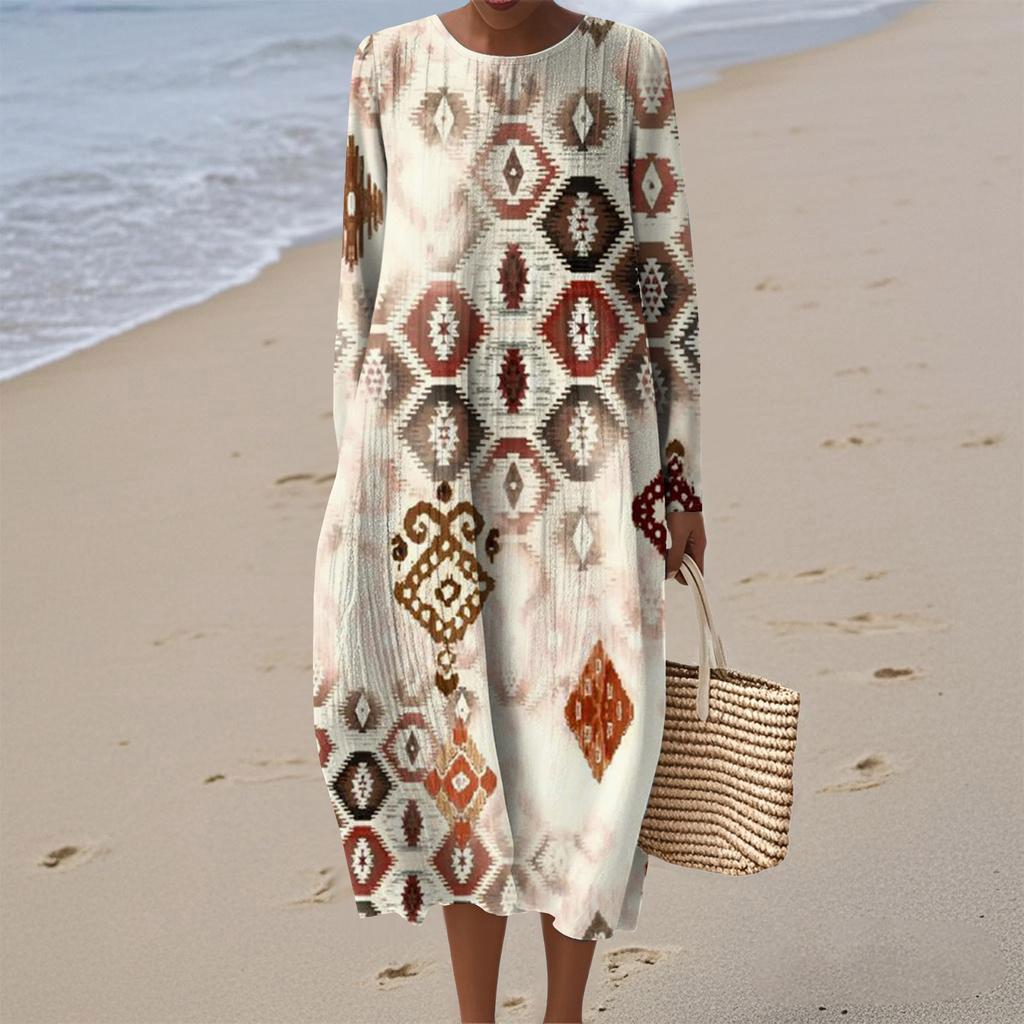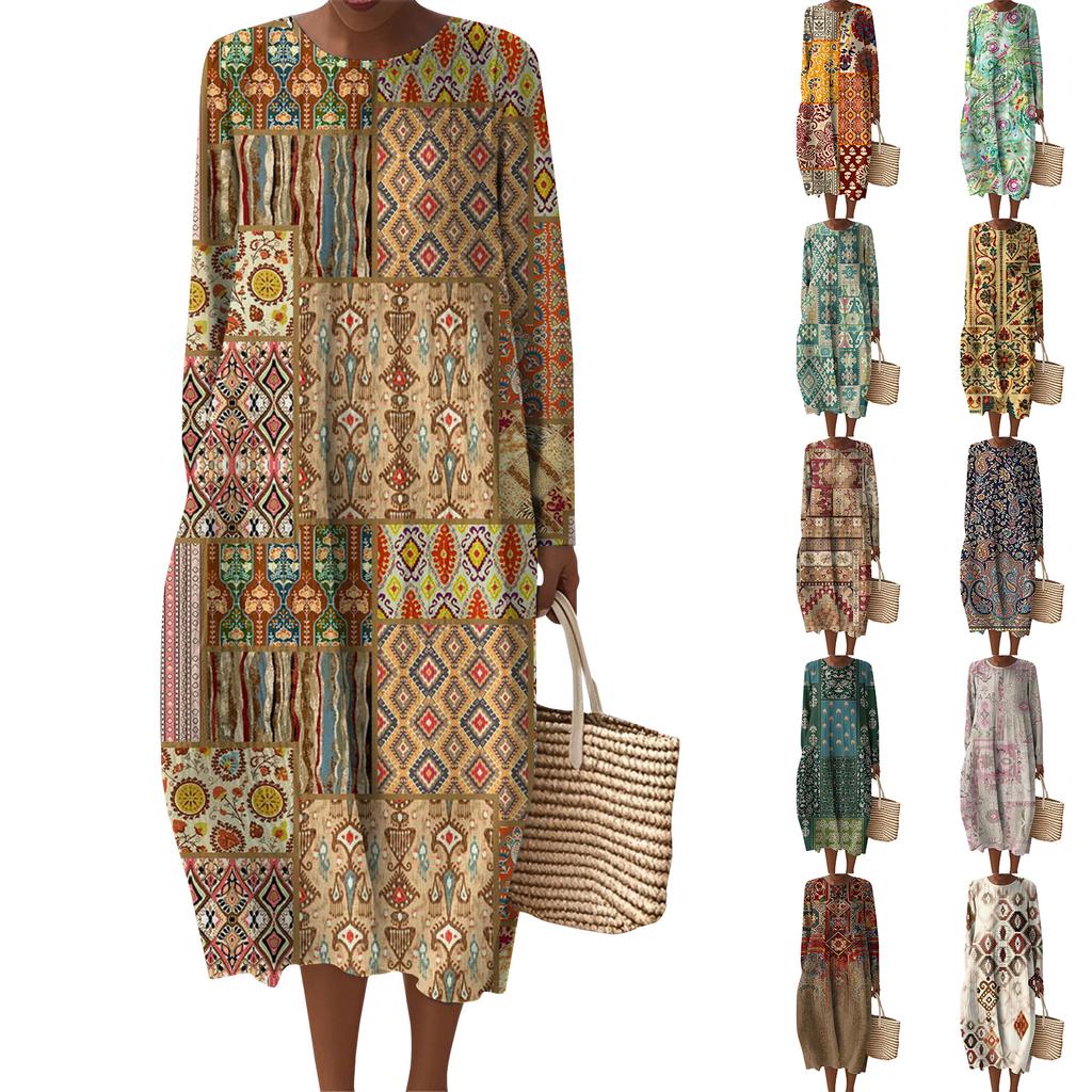 Женское модное повседневное платье с длинными рукавами, круглым вырезом, ретро геометрическим принтом, элегантное