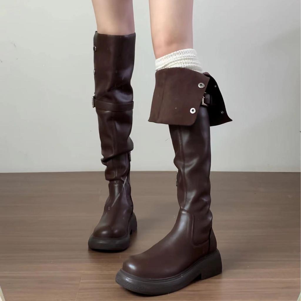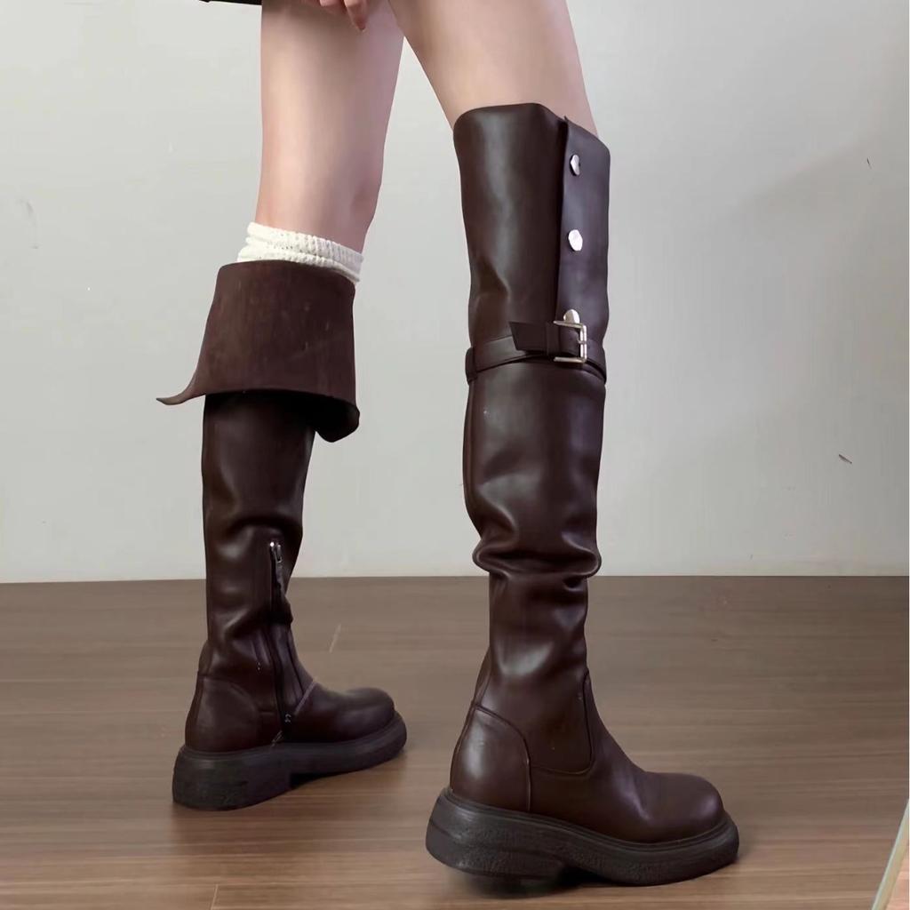 Два носят универсальные ботфорты женские ретро кожаные сапоги толстый каблук платформа сапоги для верховой езды длинные сапоги модные