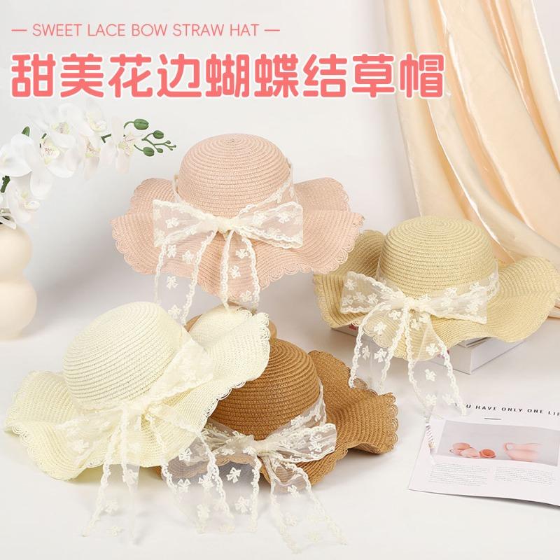 Новая милая шляпа из соломы с кружевом и бантом, летняя, солнцезащитная, с широкими полями, модная кружевная шляпа с лентами