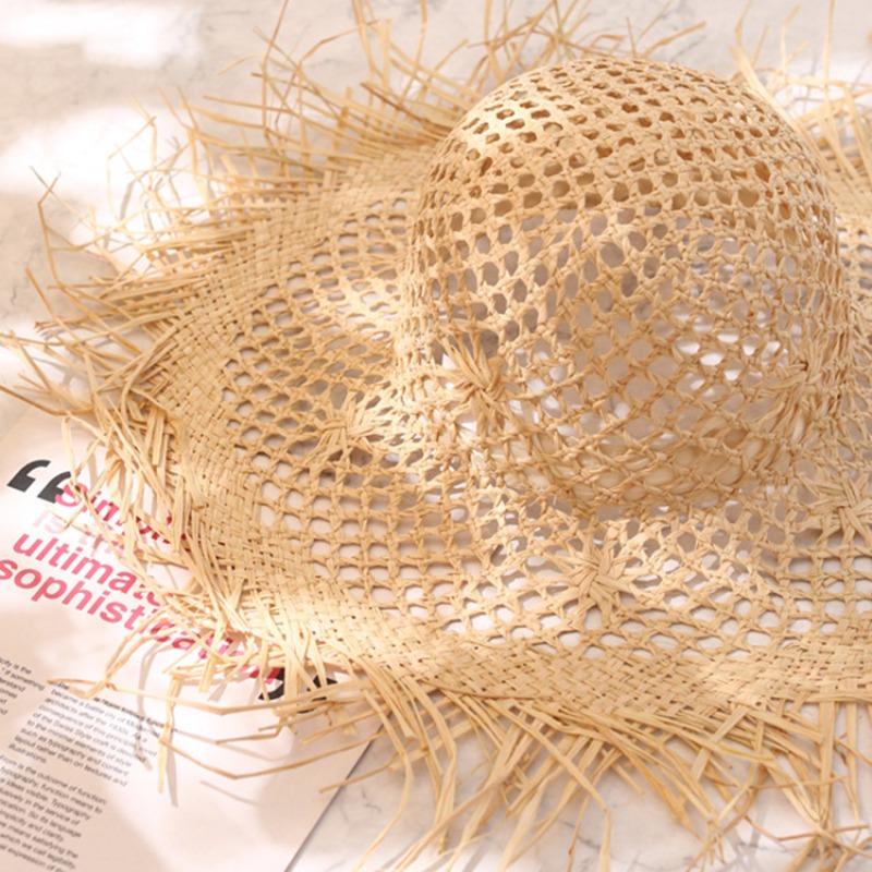 Летняя соломенная шляпа с прорезями, женская новая пляжная шляпа для фото, солнцезащитная шляпа, женская шляпа с большими полями, повседневная однотонная шляпа из соломы рафия с необработанными краями