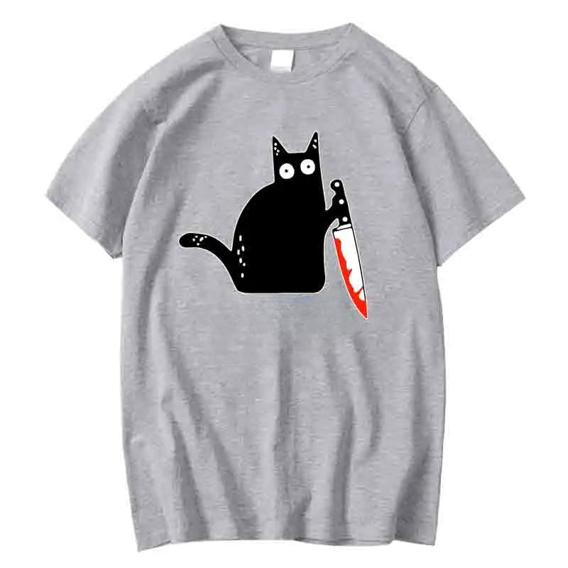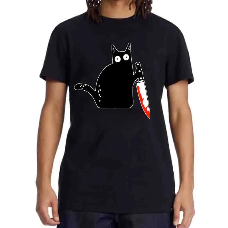 Забавные мультяшные футболки с принтом кота с ножом, мужская модная повседневная футболка с коротким рукавом, свободная, дышащая, из чистого хлопка