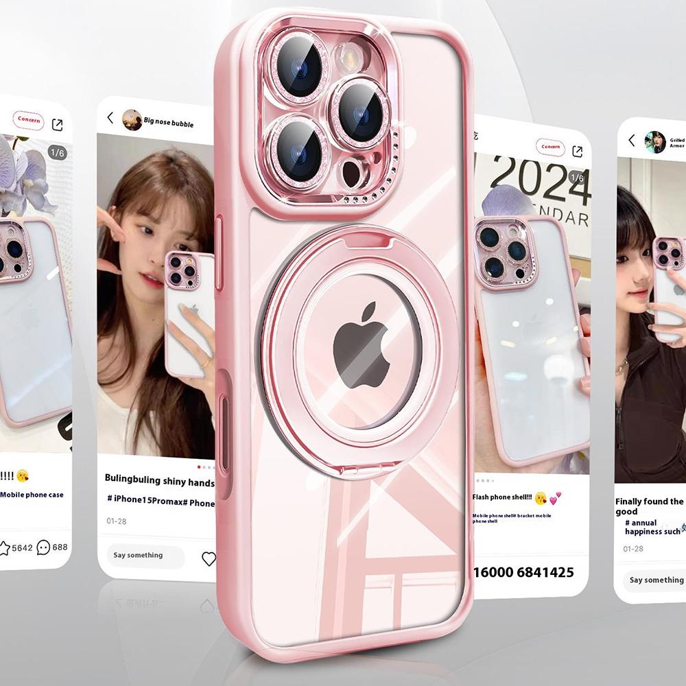 For iPhone 16 Pro Case Magnetic Rotating Kickstand PC+TPU Phone Cover with Glitter Camera Lens Film — купить товар онлайн с бесплатной доставкой по всему миру!
