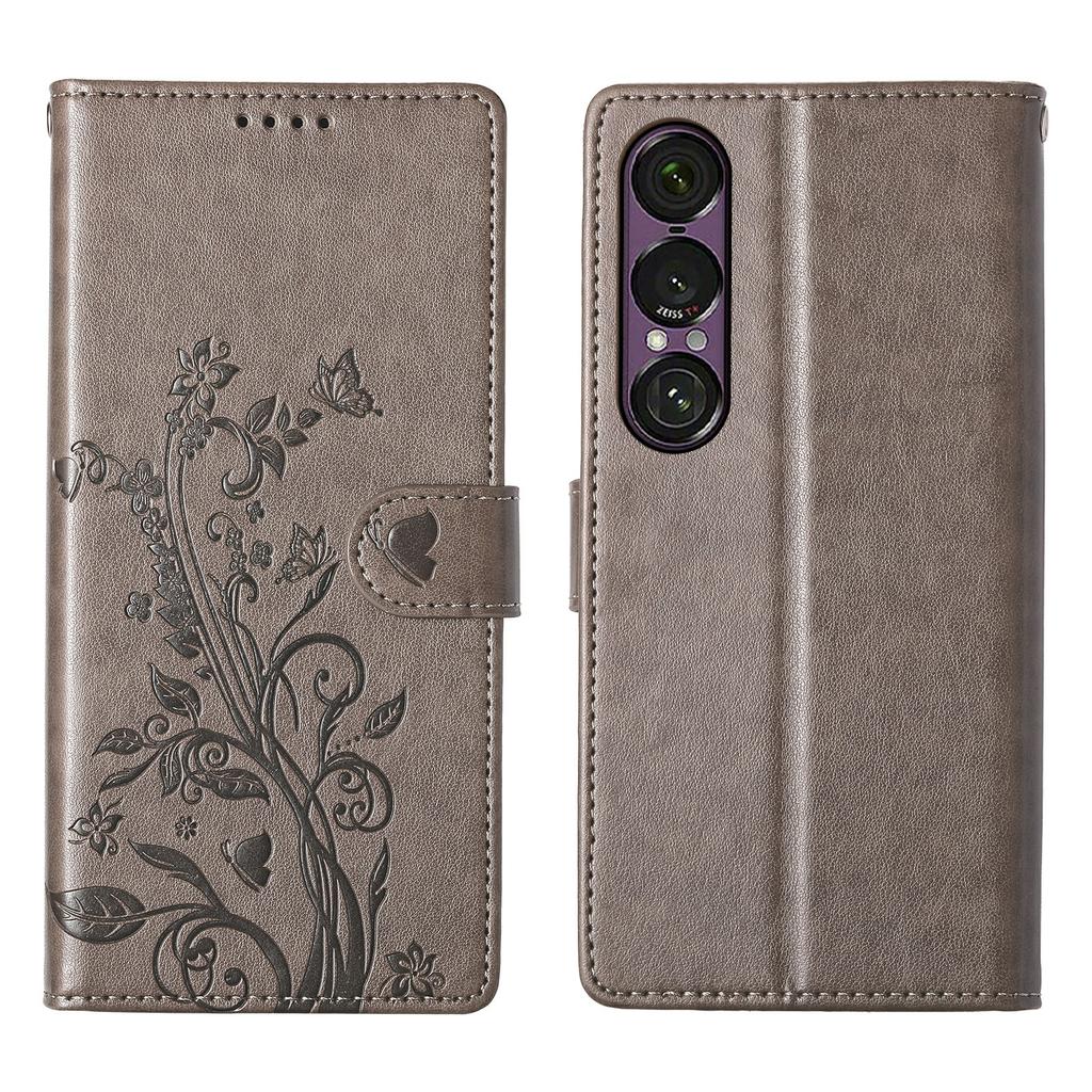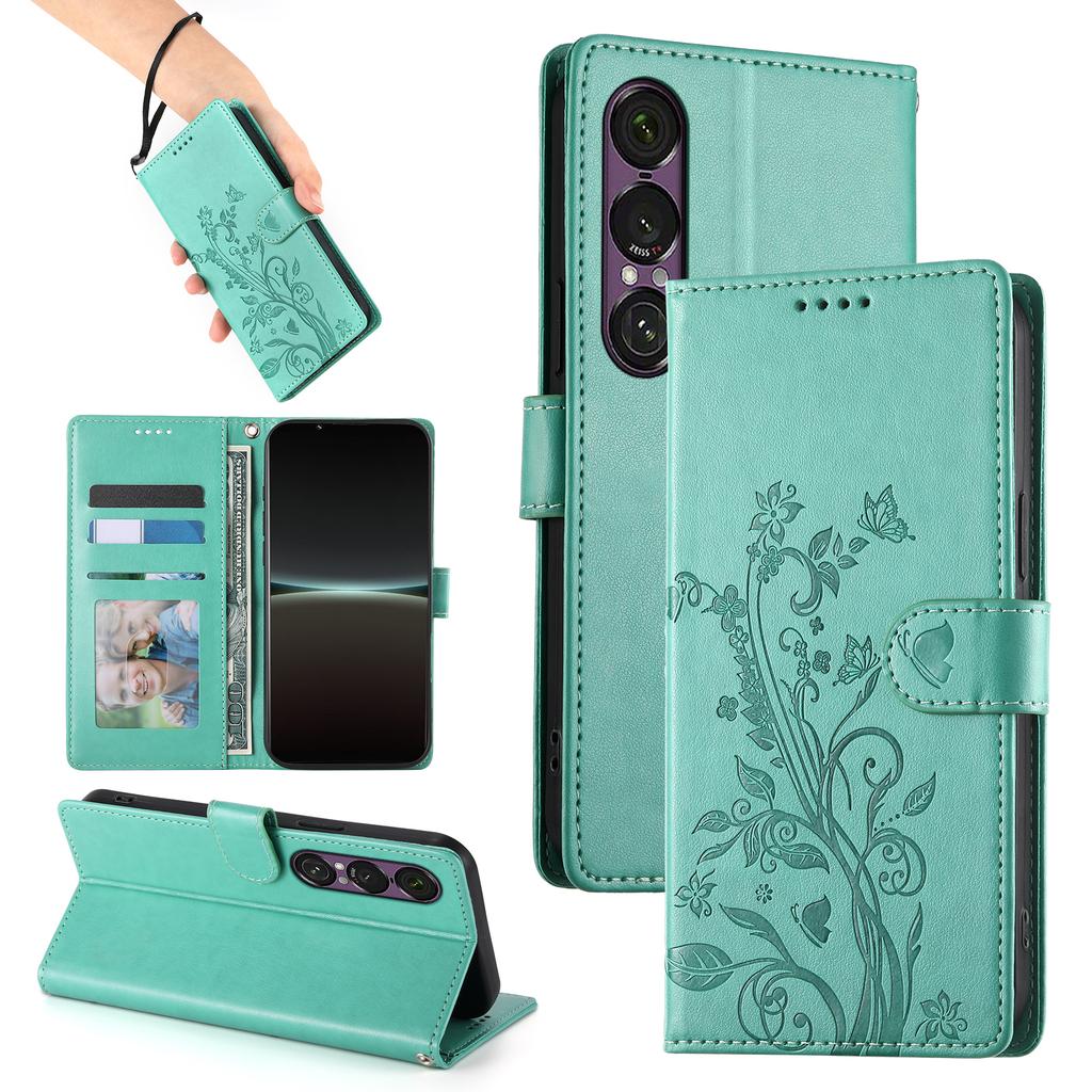 For Sony Xperia 1 VII Wallet Case Butterfly Floral Imprint PU Leather Phone Cover with Wrist Strap