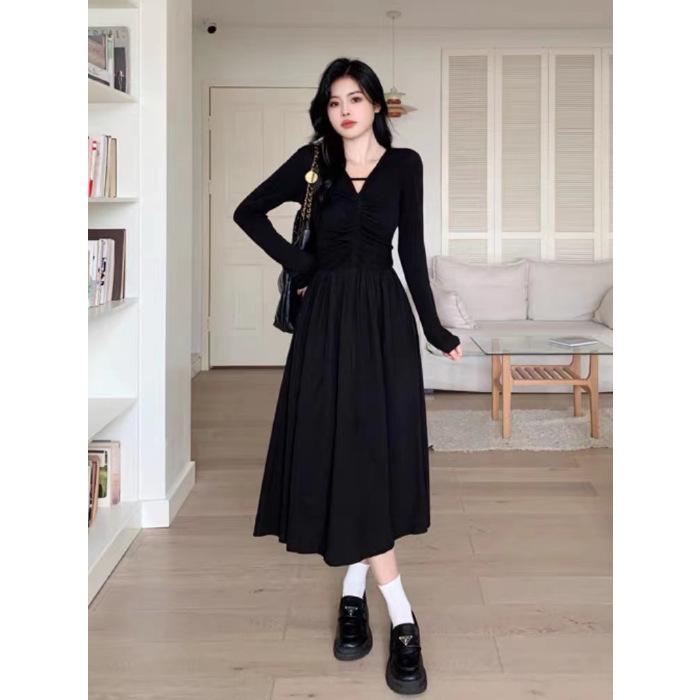 Окунитесь в неподвластную времени элегантность этого платья А-силуэта большого размера с завышенной талией и V-образным вырезом, вдохновленного классическим корейским стилем Хепберн.. Это платье, изготовленное из мягкого и прочного полиэфирного волокна, обеспечивает как комфорт, так и подчеркивающий фигуру силуэт.. Это черное платье А-силуэта с изысканным V-образным вырезом и завышенной талией, подчеркивающей ваши изгибы, идеально подходит для перехода в прохладную осеннюю погоду.. Его универсальный дизайн делает его подходящим как для повседневных выходов, так и для более формальных мероприятий, гарантируя, что вы всегда будете выглядеть стильно и чувствовать себя уверенно.