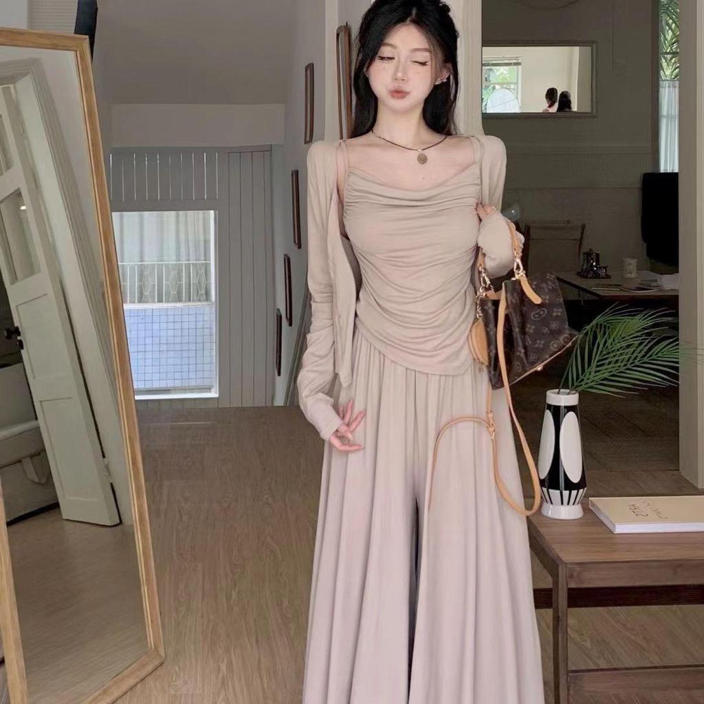 Модный женский комплект-тройка для ранней осени: Необычная майка, кардиган и брюки с высокой талией — купить товар онлайн с бесплатной доставкой по всему миру!