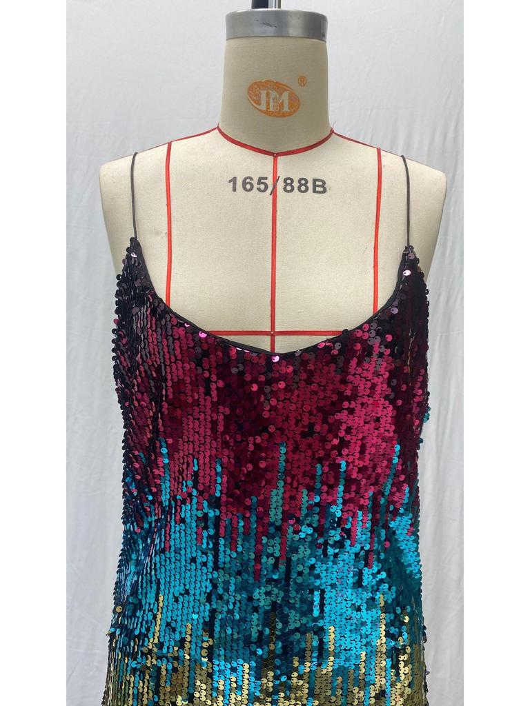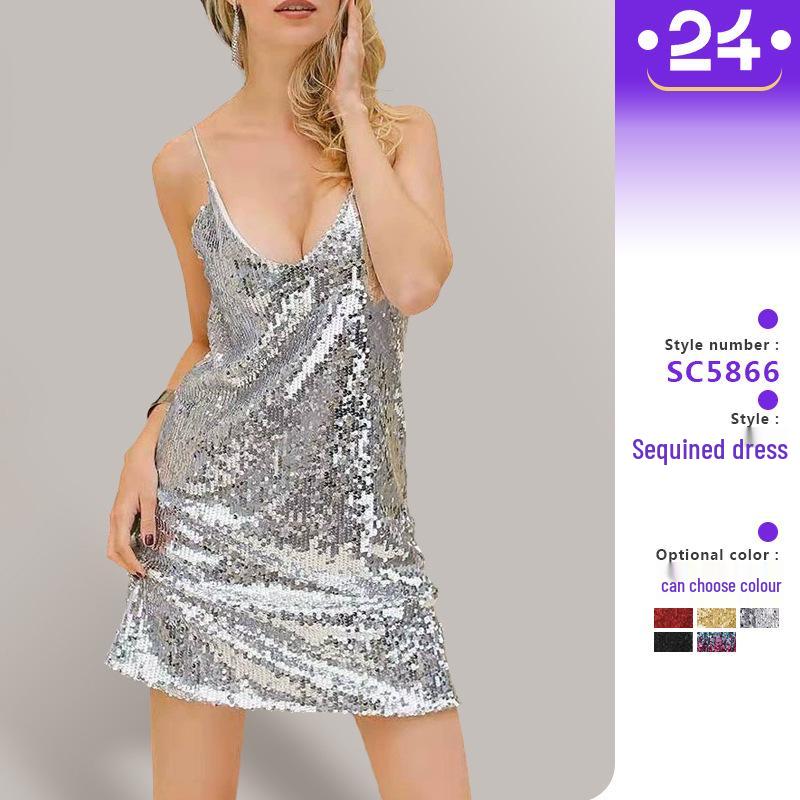 Летнее мини-платье без рукавов с пайетками и V-образным вырезом для женщин - Сексуальный европейский и американский стиль на бретелях-спагетти