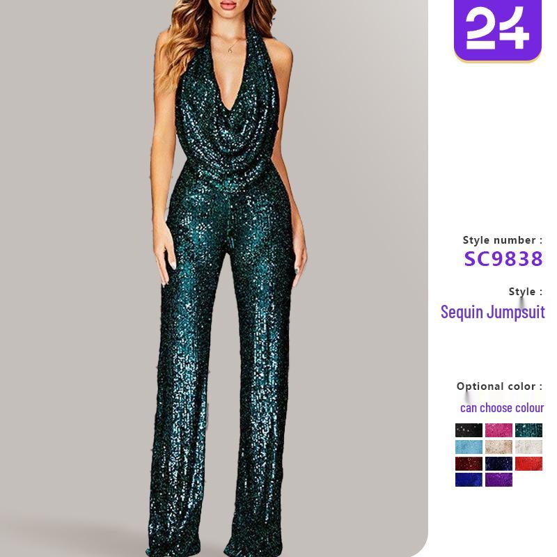 Летний комбинезон без рукавов с бретелью через шею и пайетками 2025 года для женщин