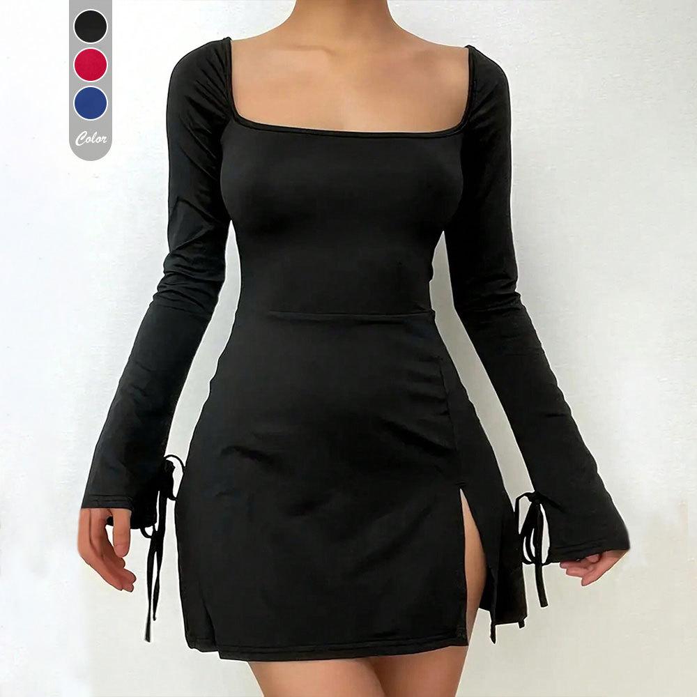 Платье А-силуэта с красным квадратным вырезом в европейском и американском стиле - Осенне-зимнее с высокой талией и разрезом