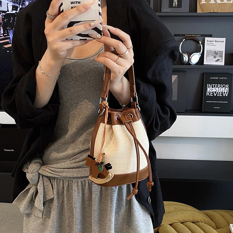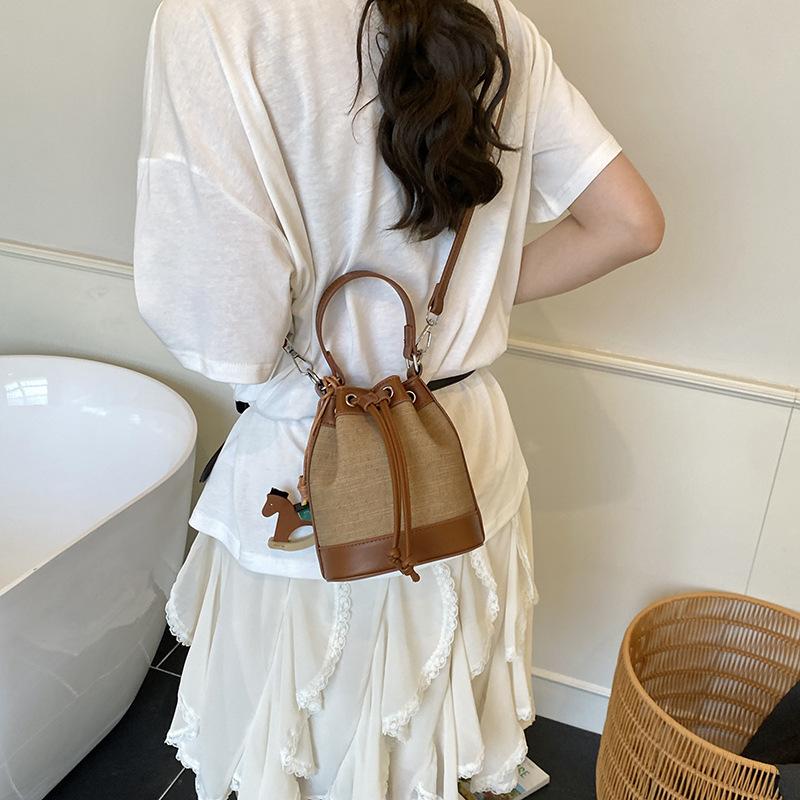 Сумка кроссбоди из ПУ в форме ведра с брелоком: Весом 0,23 кг, он имеет плетеную текстуру из ПУ на корпусе, классический силуэт ведра и милый шарм в форме лошадки.. Поддерживает ношение на одном плече или через плечо (Регулируемый ремешок 120 см). Идеально подходит для добавления стильного, игривого штриха к повседневным выходам, свиданиям или неформальным встречам.