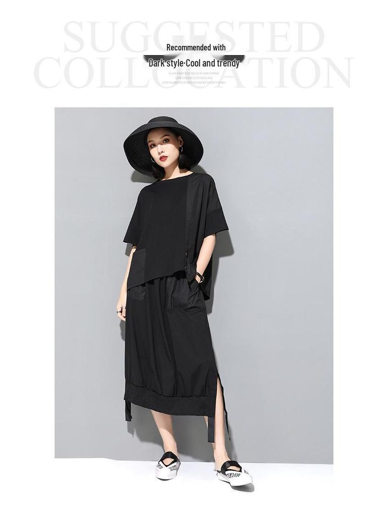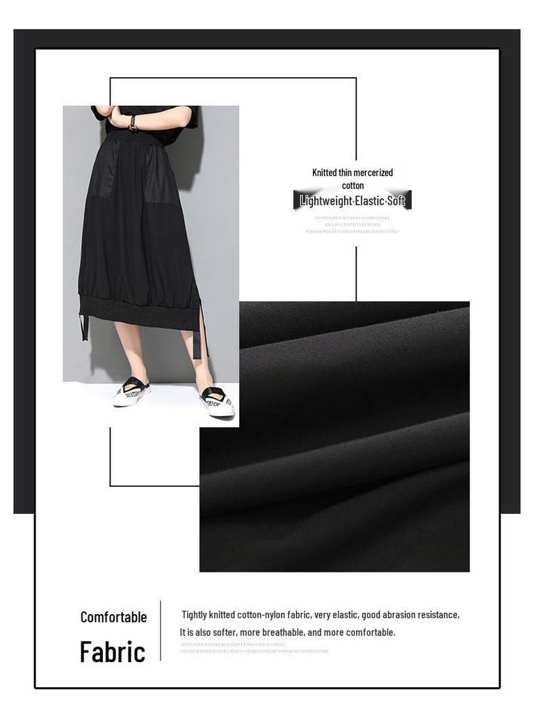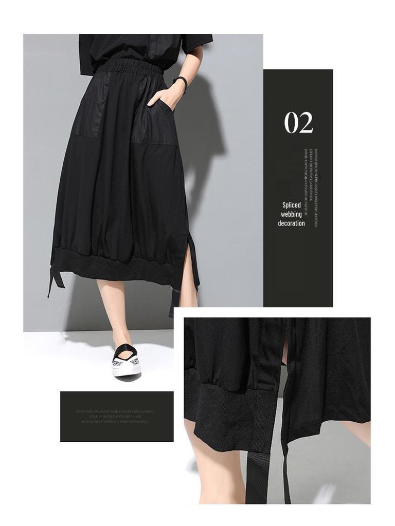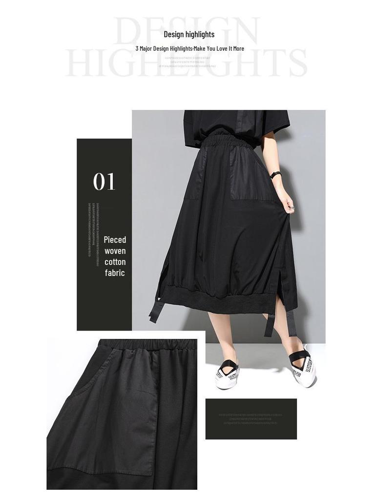 Летняя женская юбка А-силуэта в темном холодном стиле с разрезом, накладным карманом и эластичной талией