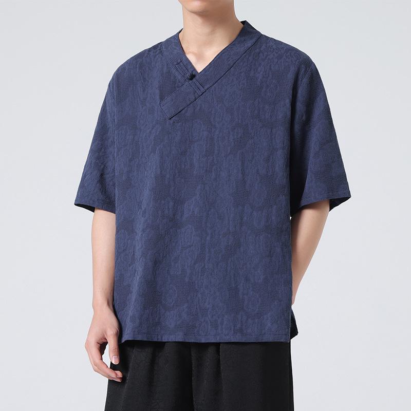 Ощутите суть традиционной китайской моды с этой стильной мужской летней футболкой. Изготовлено из дышащей хлопковой смеси, обеспечивает исключительный комфорт и ощущение легкости, идеально для теплой погоды. Короткие рукава обеспечивают свободную посадку, а уникальная застежка на пуговицу-лягушку добавляет аутентичный штрих его дизайну в стиле ханьфу.. Эта футболка больших размеров легко сочетает современный комфорт с классическими элементами для создания отличительного и стильного образа.