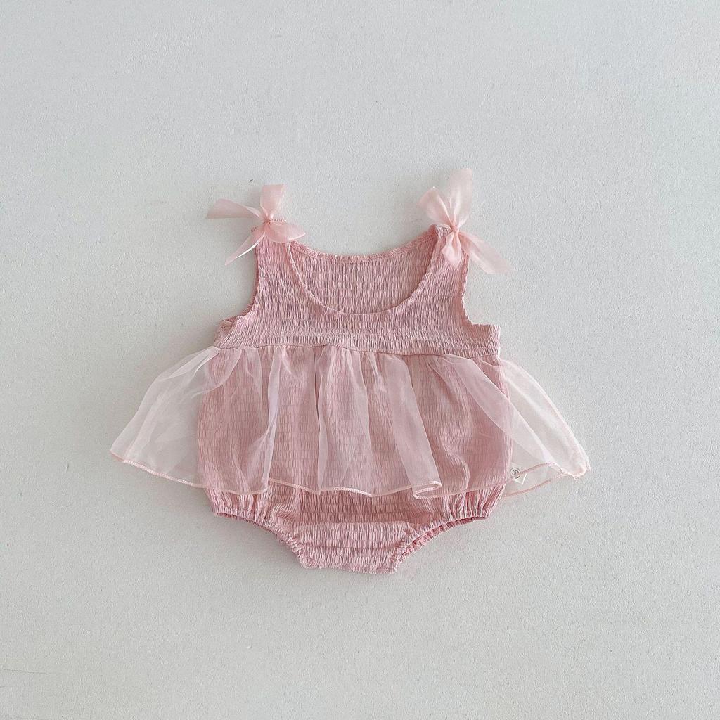Летний детский комбинезон: Розовое сетчатое платье принцессы со сладким бантом для новорожденных девочек