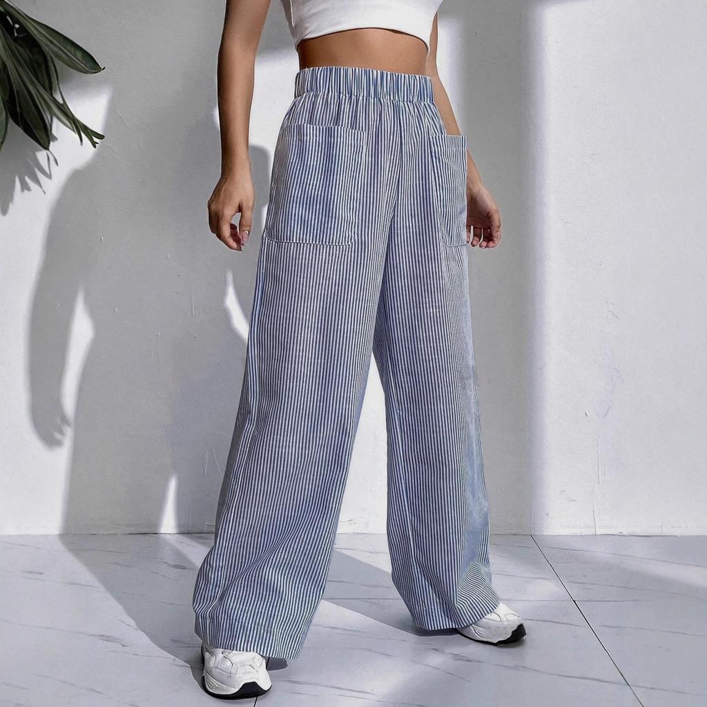 Женские сине-белые полосатые брюки с широкими штанинами и карманами, удобные повседневные брюки с высокой посадкой — купить товар онлайн с бесплатной доставкой до всему миру!