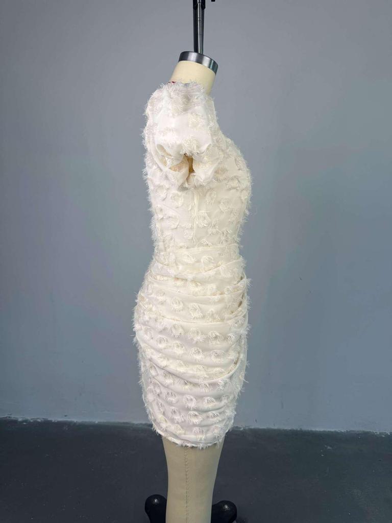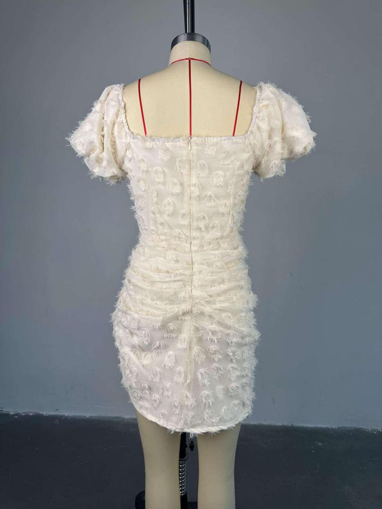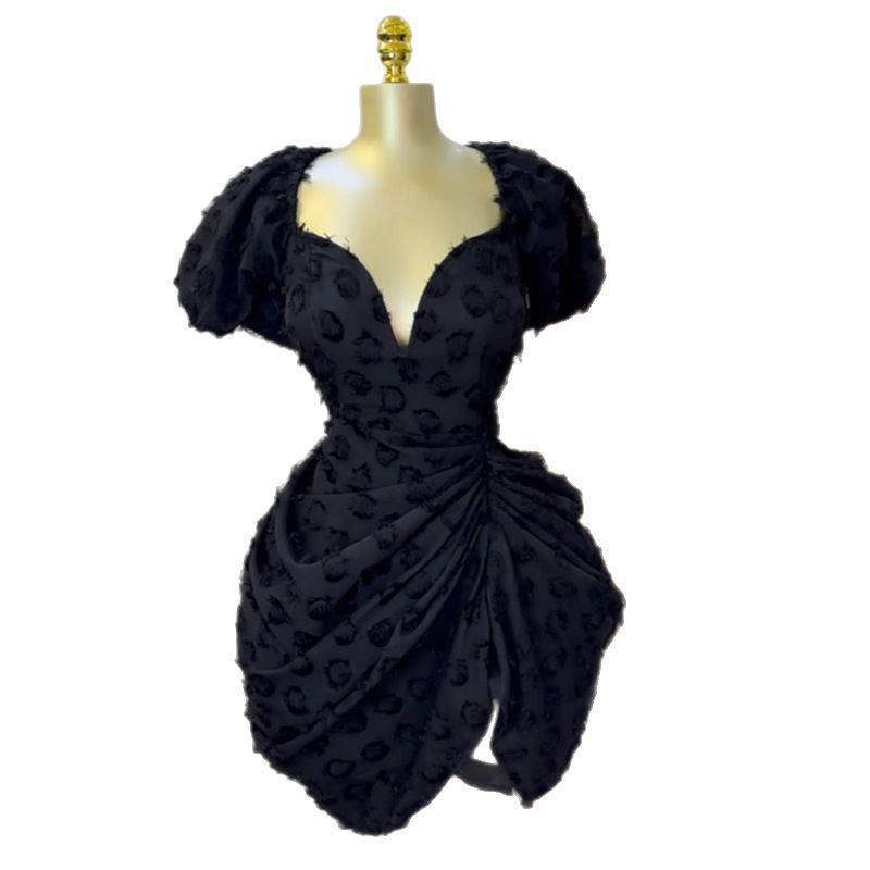 2025 Весна/Лето Сексуальное платье мини с V-образным вырезом, пышными рукавами, высокой талией, утягивающее, с драпировкой, для женщин