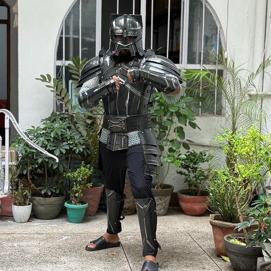 Доспехи могут похвастаться потрясающей матово-черной и темно-железной отделкой, напоминающей кованую сталь из глубины горных залов.. Он украшен тонкими металлическими акцентами, придающими ему изношенный, готовый к бою вид, словно прямо из эпического произведения Толкина.