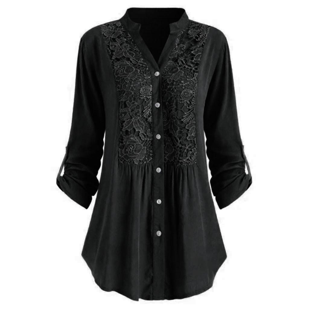 Женщины Дамы большого размера кнопки кружева V шеи рубашка с длинным рукавом Blous