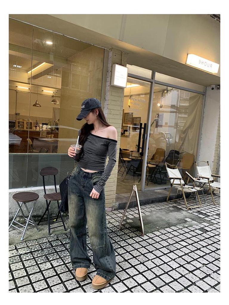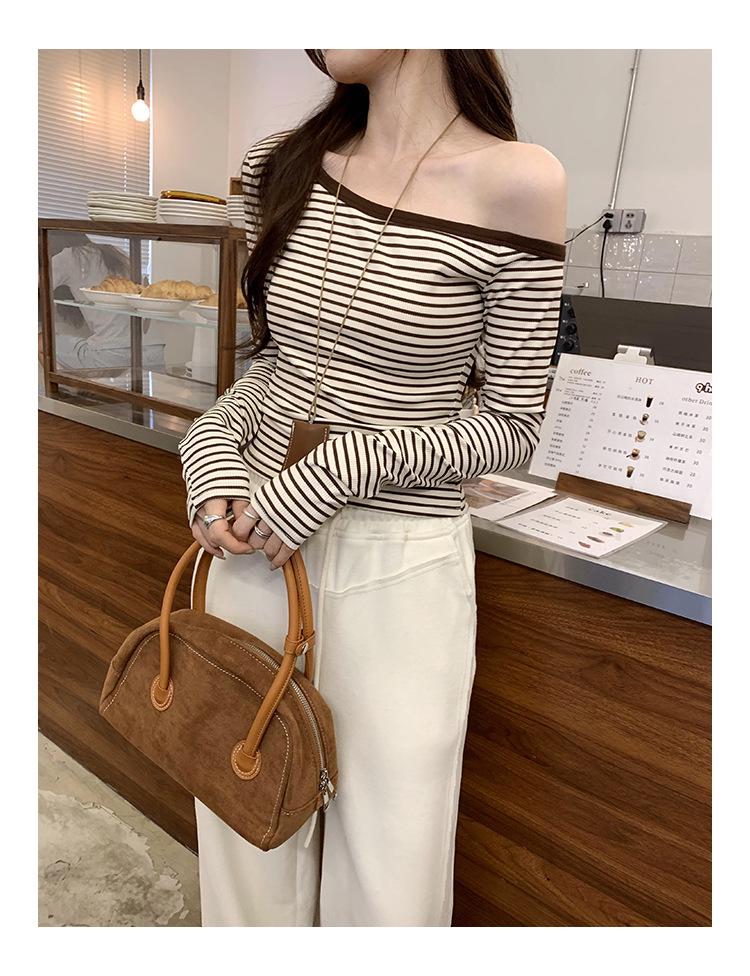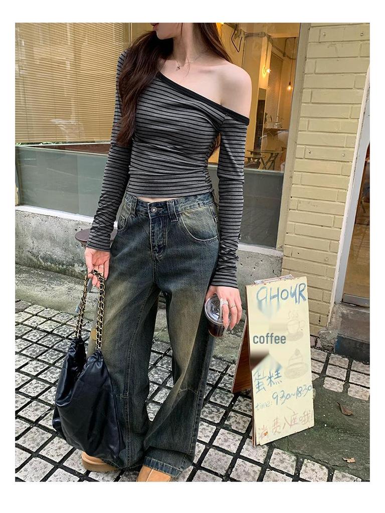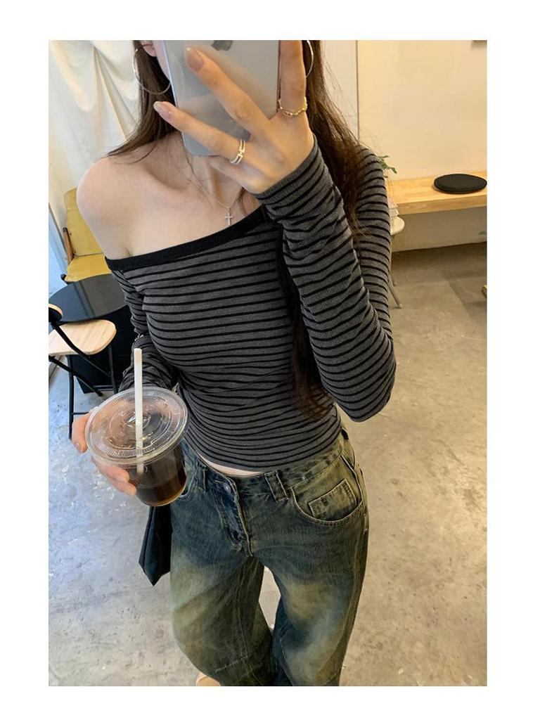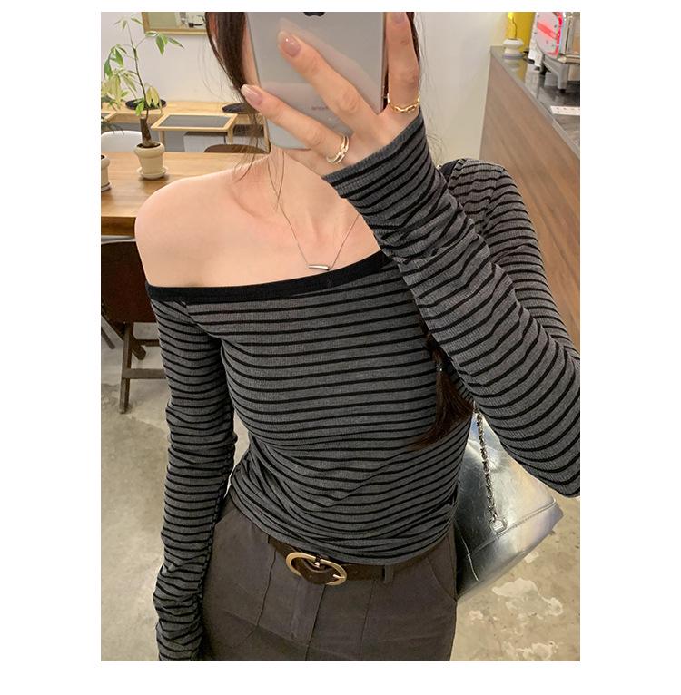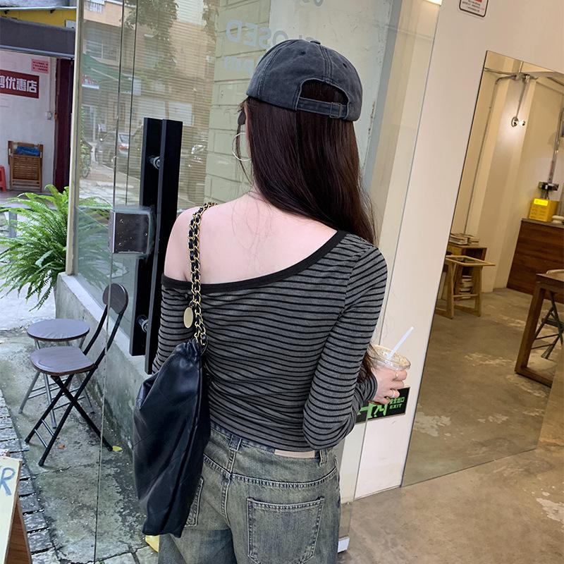 Шикарная серая полосатая футболка с длинным рукавом на одно плечо - Женский осенний корейский стиль, облегающий топ с открытым плечом