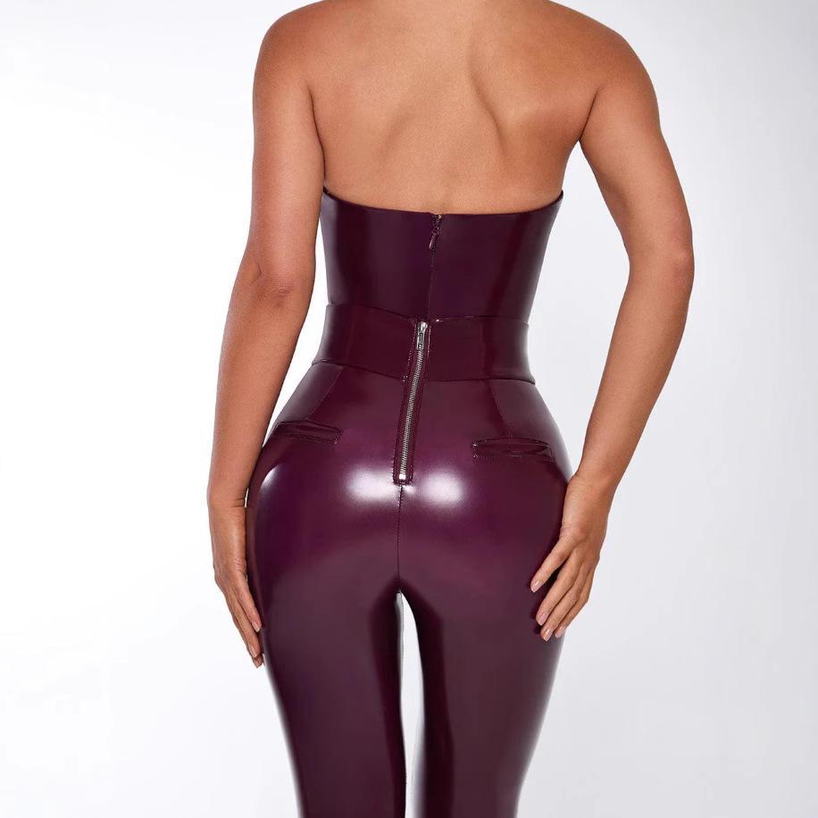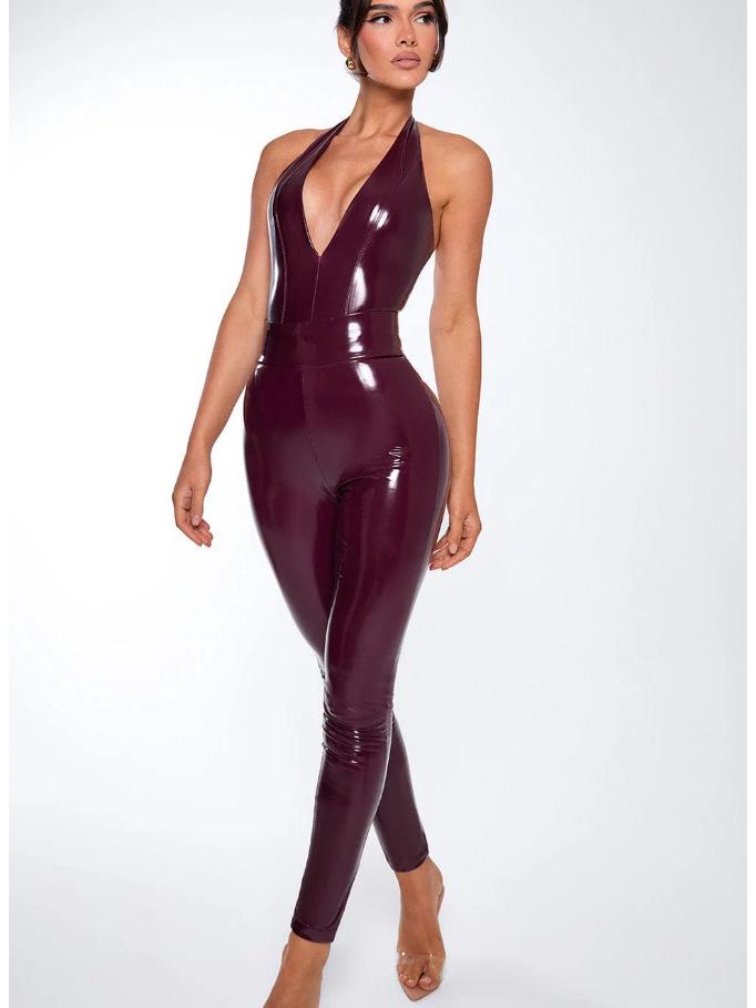 Новый трансграничный сексуальный комбинезон-бодикон из кожи с глубоким V-образным вырезом и халтером для женщин
