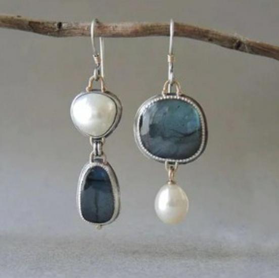 Асимметричные ретро-серьги из сине-фиолетового агата и жемчуга