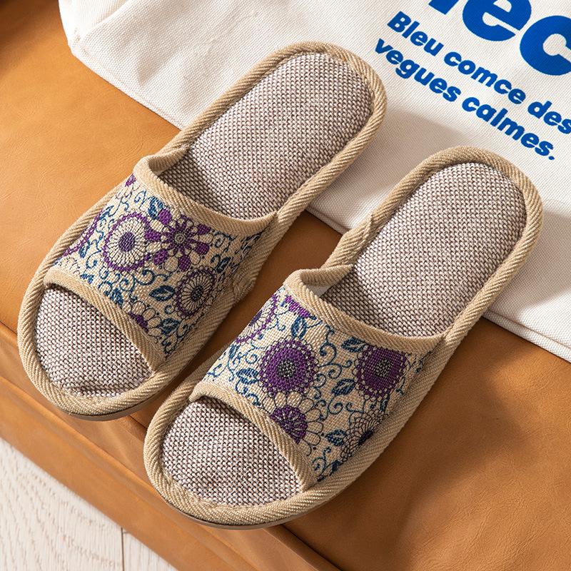 Ретро Цветочные Льняные Тапочки с Открытым Носком на Все Сезоны