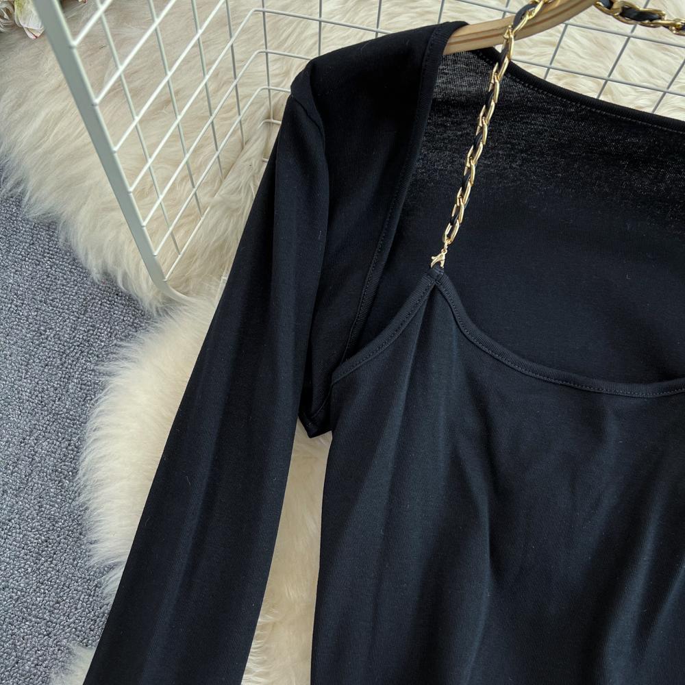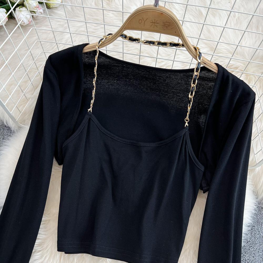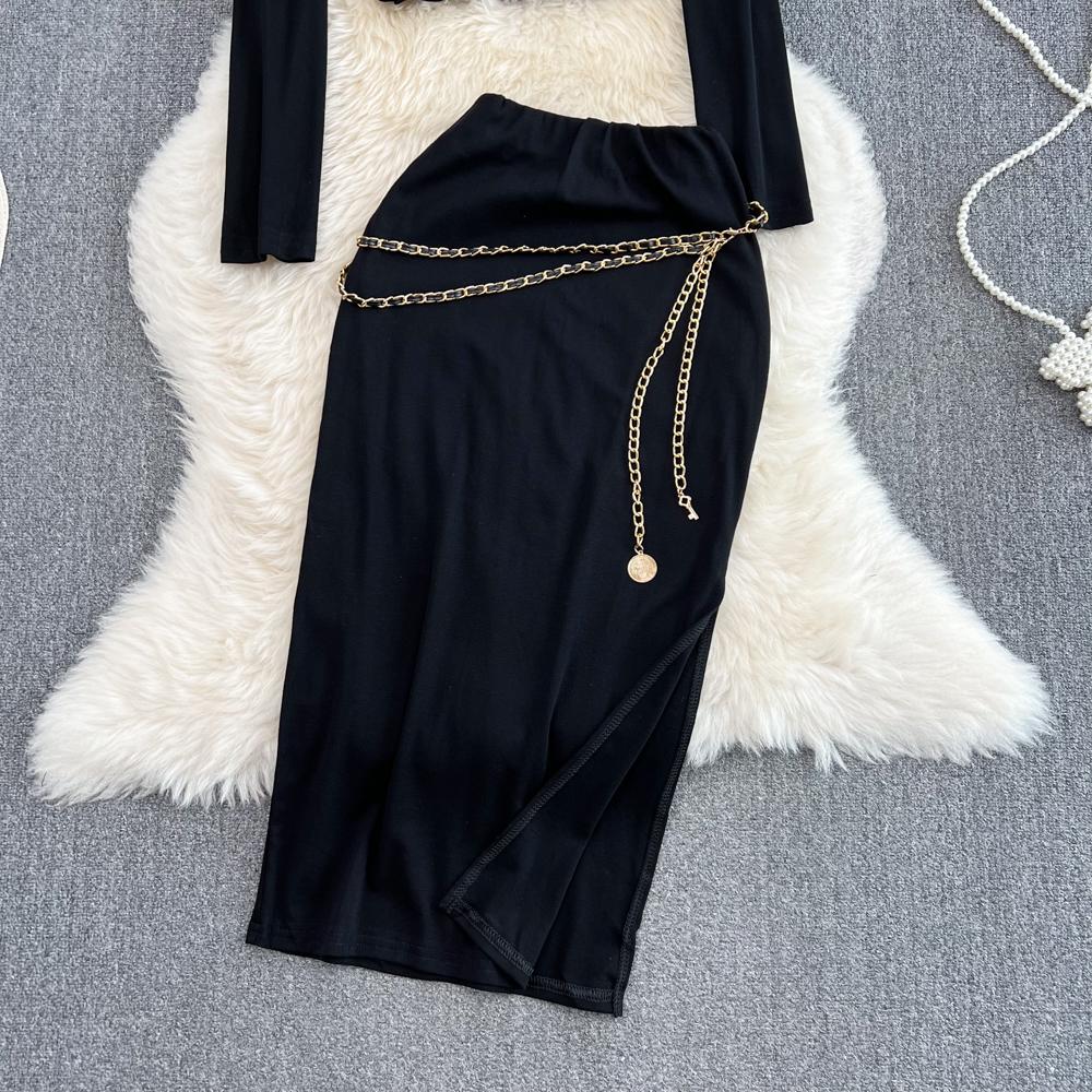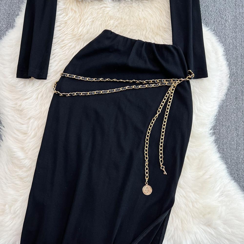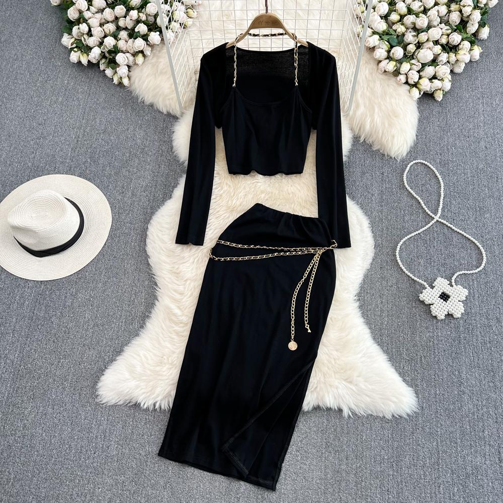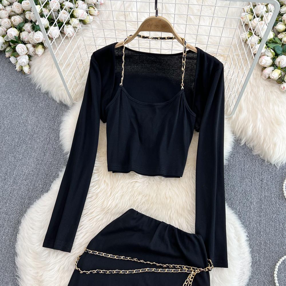 Модный костюм женский осенний цепочка халтер майка тройка шаль пальто высокая талия сумка бедра юбка