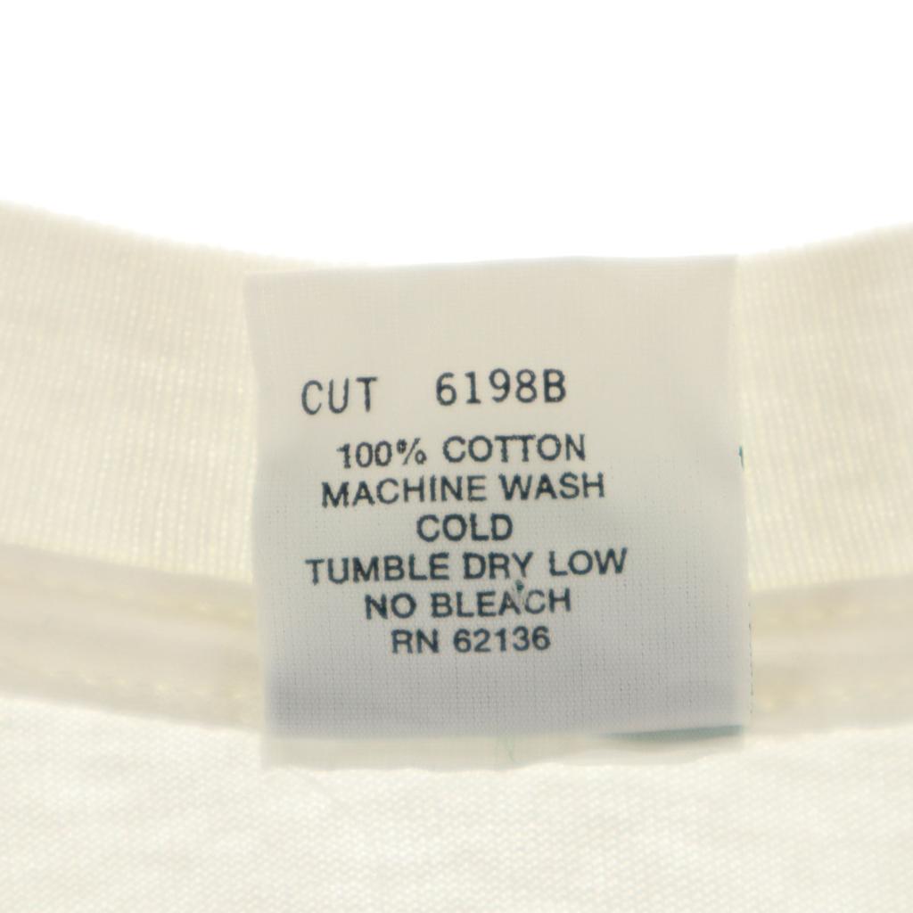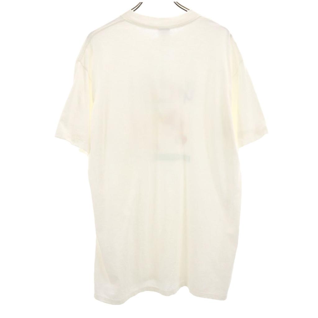 Это старая футболка с принтом из 90-х.. Есть пятна на животе и плечах. Заметных разрывов или других повреждений нет, но, пожалуйста, учтите, что это бывший в употреблении товар, перед покупкой.