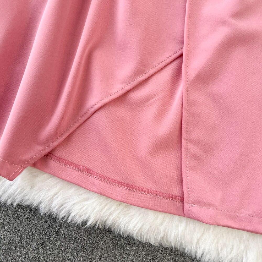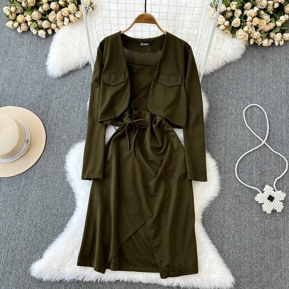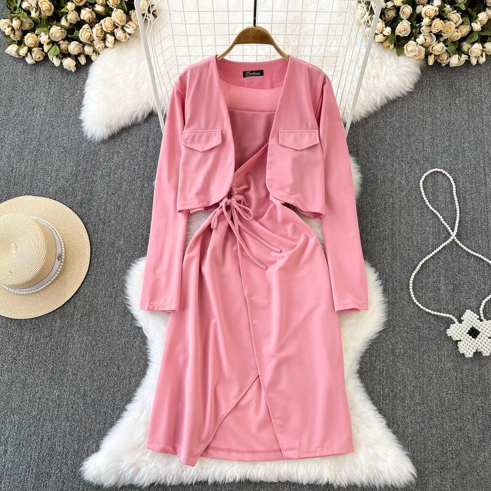 Модный костюм женский повседневный с высокой талией короткий однотонный пиджак костюм двойка платье халтер с разрезом на шнуровке осень