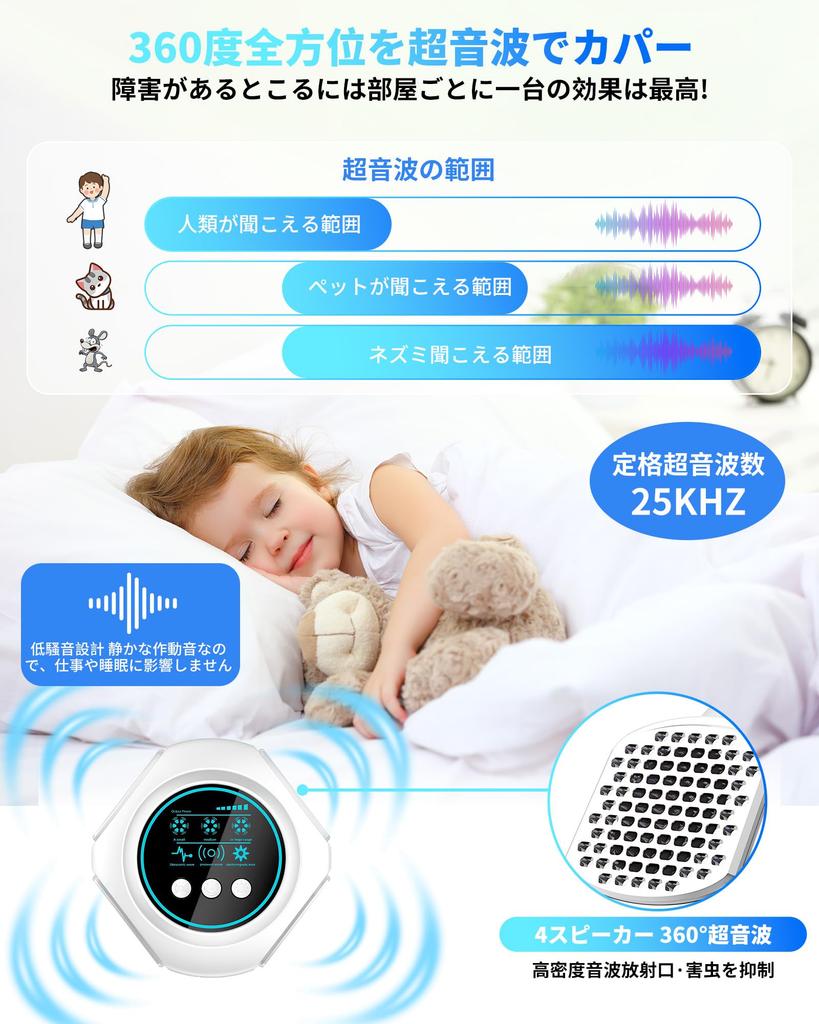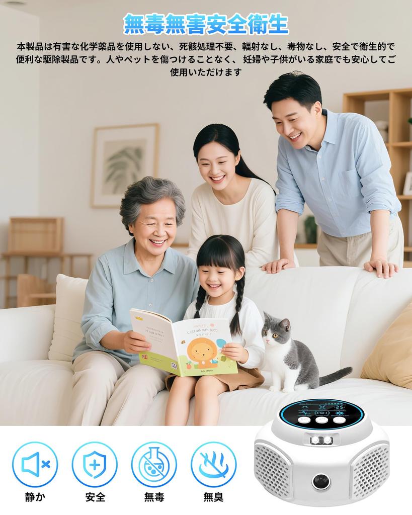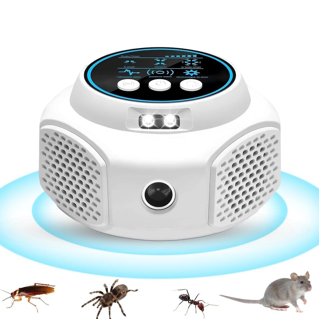 [Нетоксичный, без запаха, безвредный и экологически чистый] Это устройство для борьбы с вредителями не использует химические вещества. Вы можете беспокоиться об использовании химикатов, смога или спреев в домах с детьми или беременными женщинами. Он не выделяет вредных веществ, что делает его безопасным для детей и беременных женщин.. Ультразвуковые волны, которые он излучает, физически разрушают среду обитания вредителя, воздействуя только на вредителей и мышей. Это предотвращает повреждение продуктов питания и мебели. Допускается размещение с домашними животными: Этот продукт безопасен для домашних животных и не причинит вреда обычным домашним животным, таким как собаки и кошки.. Однако, требуется осторожность с мелкими животными (хомяки, птицы и т.д.).