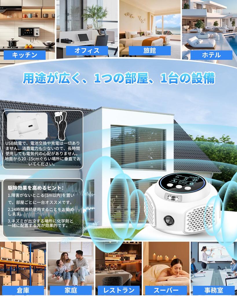[Особенности и содержимое упаковки] Этот ультразвуковой отпугиватель излучает ультразвуковые волны и мигает светодиодом, чтобы стимулировать нервную систему и слух вредителей и грызунов, вызывая дискомфорт и прогоняя их с территории. Как пользоваться: 1. Подключите устройство к прилагаемому шнуру питания и адаптеру, пока не загорится синий светодиод на ЖК-экране.. 2. Нажмите кнопку открытия/закрытия, чтобы открыть устройство, и оно автоматически запустится в ультразвуковом режиме.. Это параметр по умолчанию. 3. Нажмите кнопку переключения режима для переключения между тремя режимами работы. При переключении режимов загорается соответствующий светодиод режима.. 4. Для управления функцией вспышки нажмите кнопку вспышки, чтобы включить или выключить ее.. [Содержимое упаковки] Ультразвуковой блок драйвера мыши x 1, Зарядный кабель Type-C x 1, Инструкция на японском языке x 1.