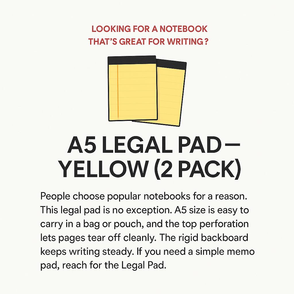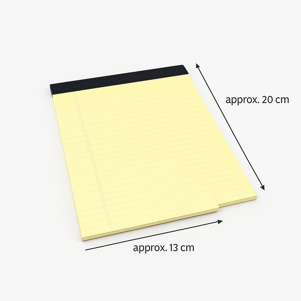 Решение: Этот классический блокнот формата А5 — идеальное решение для организованных умов в движении.. Размер А5 (примерно половина стандартного листа формата А4) достаточно компактный, чтобы идеально поместиться в сумочку, рюкзак или небольшой портфель. Его фирменная юридическая разметка обеспечивает четкие линии для структурированного ведения заметок, позволяя легко создавать списки дел, составлять конспекты встреч или генерировать идеи без беспорядка.