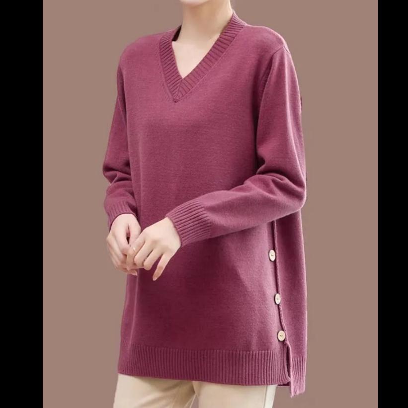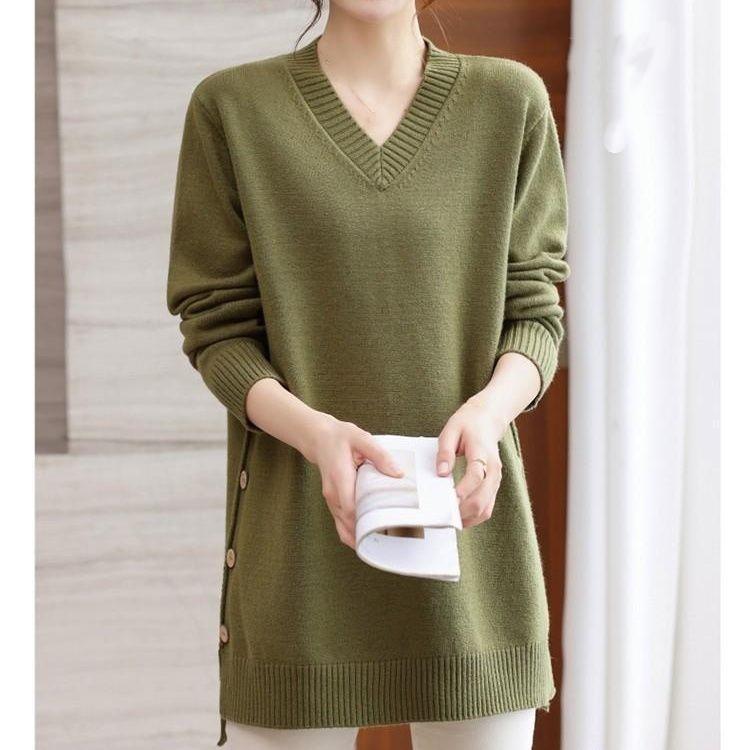 Осень и Зима Большой Размер V-образный вырез Средней длины Базовая рубашка Свободный Однотонный Толстый Вязаный Свитер Женский Тренд