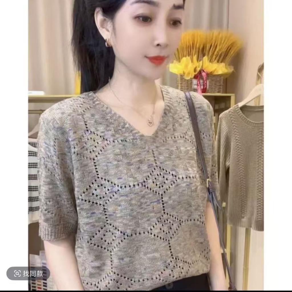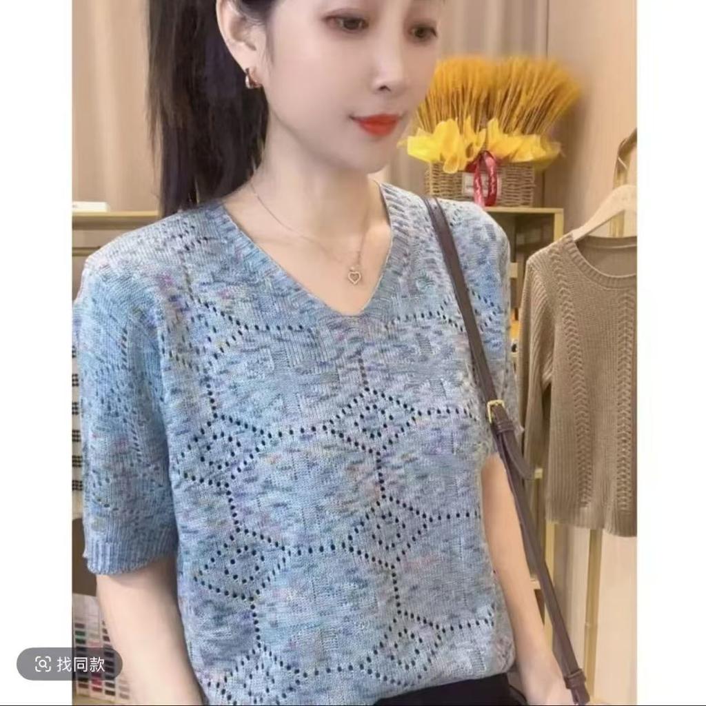 Женская вязаная футболка с V-образным вырезом, свободный пуловер, летний вязаный универсальный топ с коротким рукавом