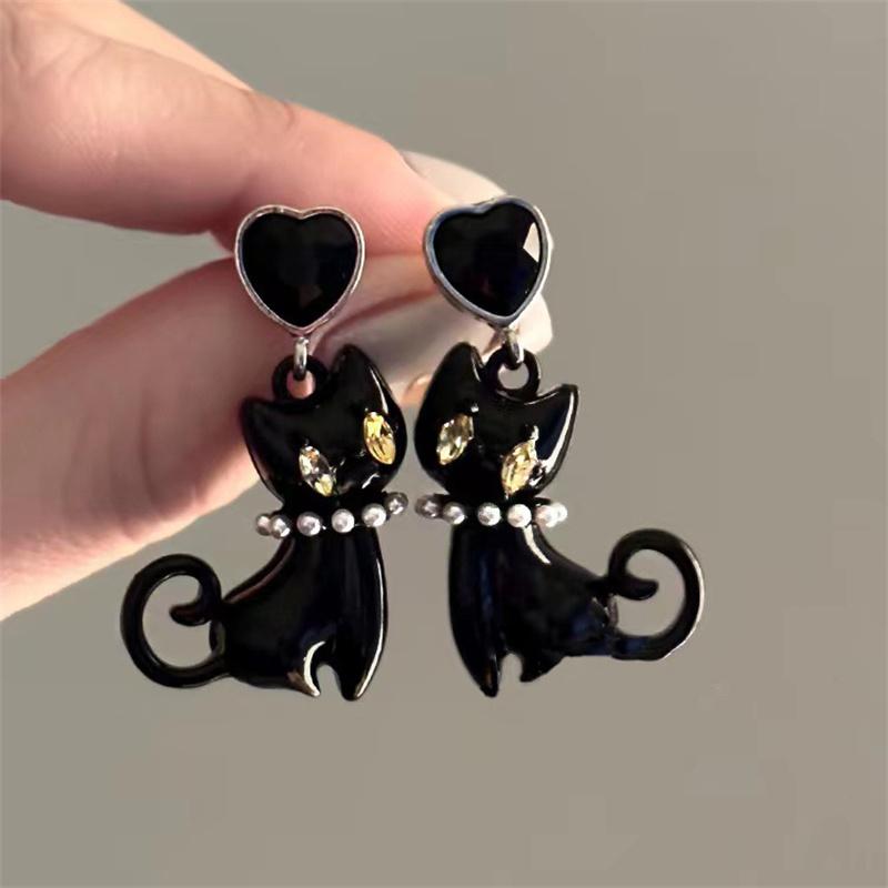 Милые серьги-подвески в виде кристального сердца и котенка для женщин, мультяшные животные, черная кошка, забавные повседневные украшения, аксессуары