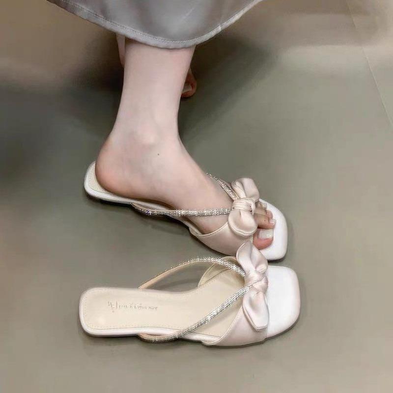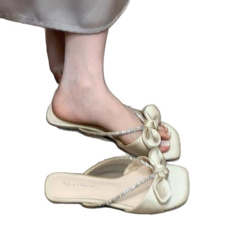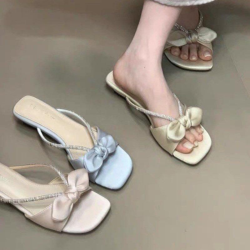 Красивые шлепанцы на низком каблуке для летней женской носки, новые с юбкой, однословные шлепанцы с горным хрусталем