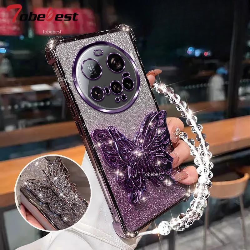 Противоударный чехол с блестящим покрытием для Xiaomi 15 Ultra 14 14T 13 12 11 Pro Lite 3D подставка-бабочка для телефона, браслет из бусин, задняя крышка