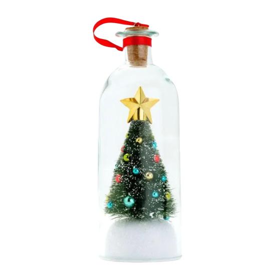 Ностальгическая Рождественская Элегантность: В прозрачной стеклянной бутылке откройте очаровательную зеленую сизалевую елку, украшенную разноцветными украшениями, на фоне снежного пейзажа.. Эта очаровательная сцена создает праздничную атмосферу на каминных полках, полках или обеденных столах.