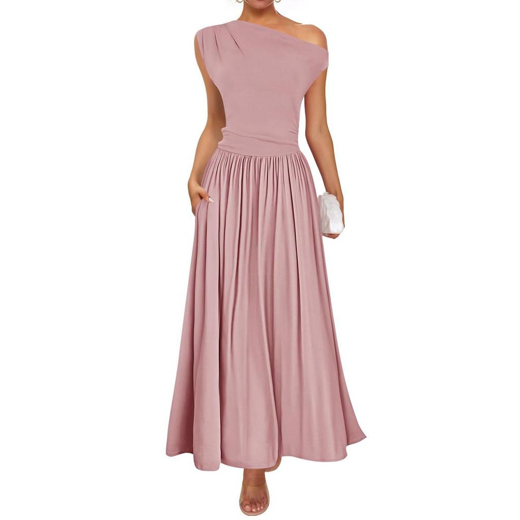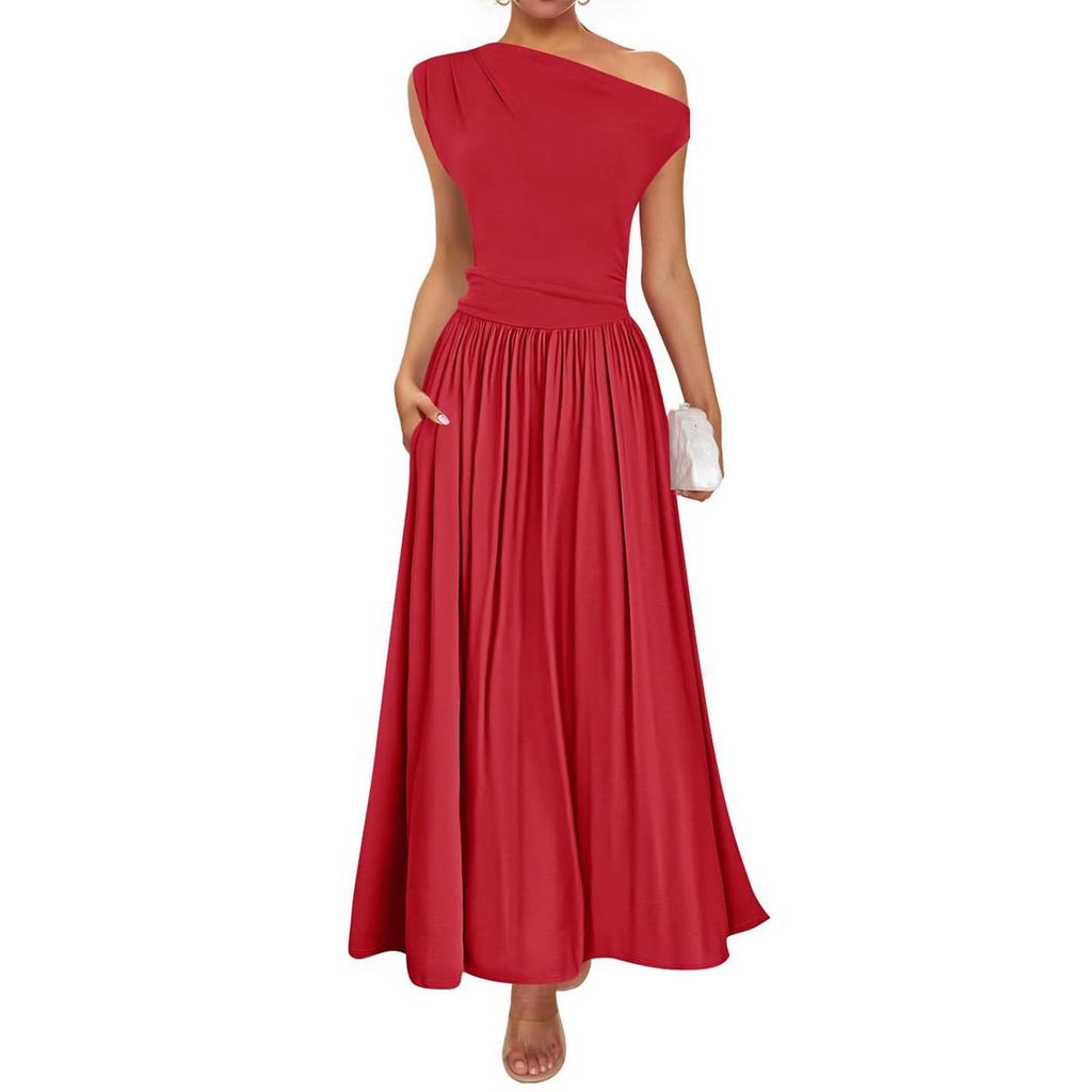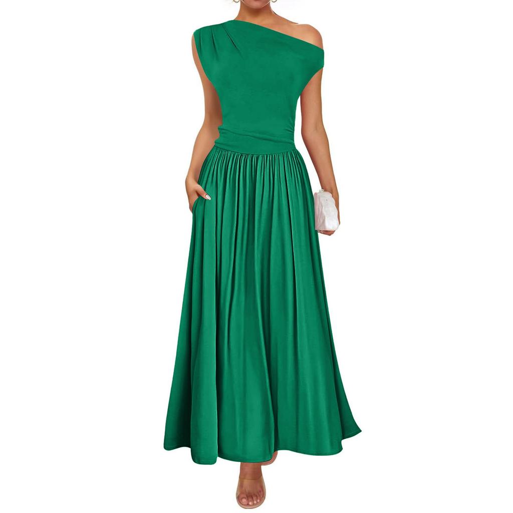 Женское модное однотонное платье с покатыми плечами и сексуальной талией, длинное платье с карманами