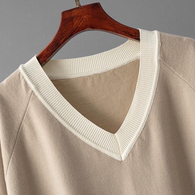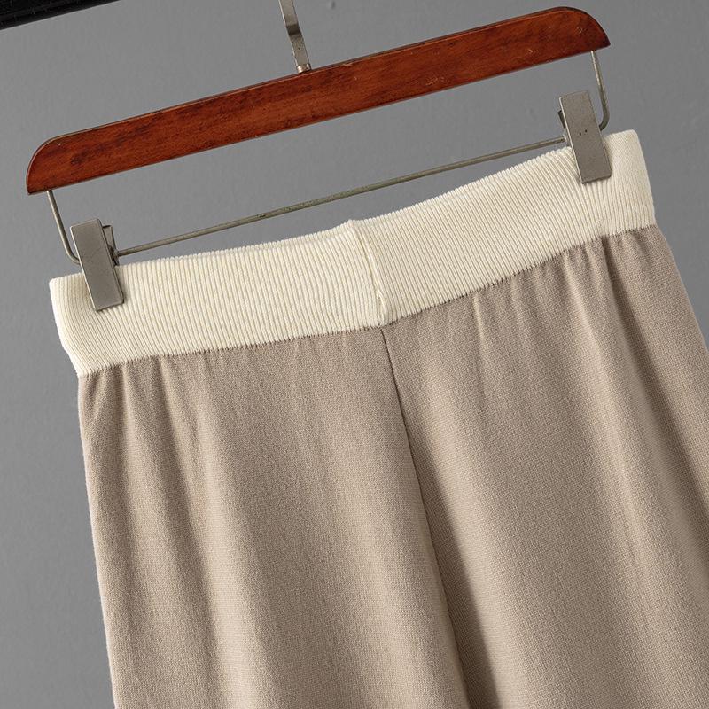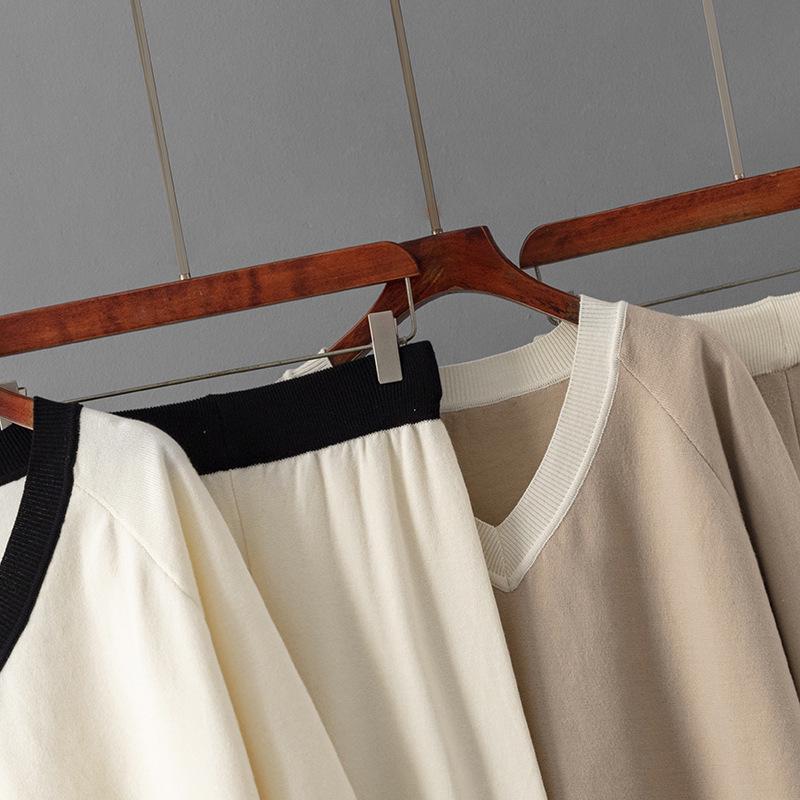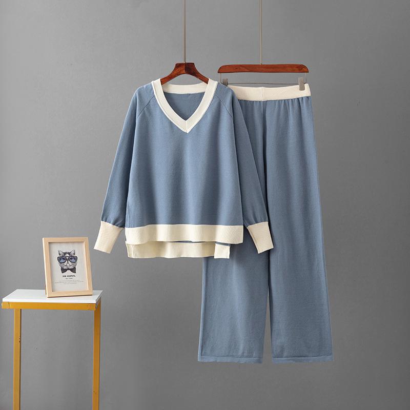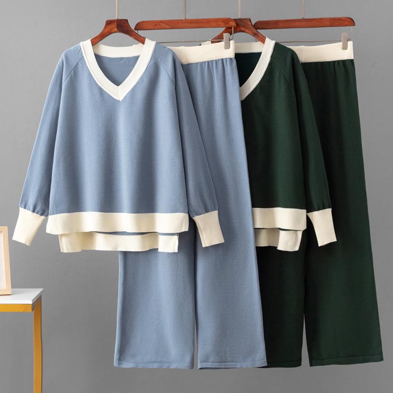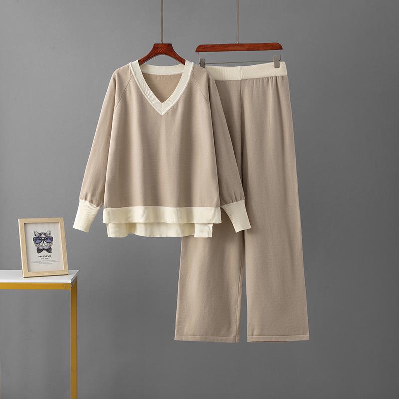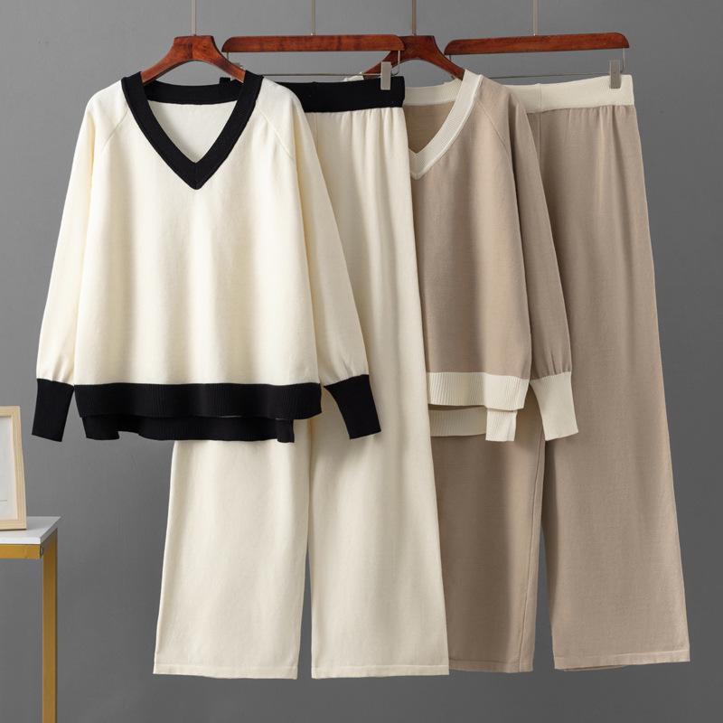Женский европейско-американский костюм-двойка с V-образным свитером и брюками широкого кроя на осень/зиму 2025.