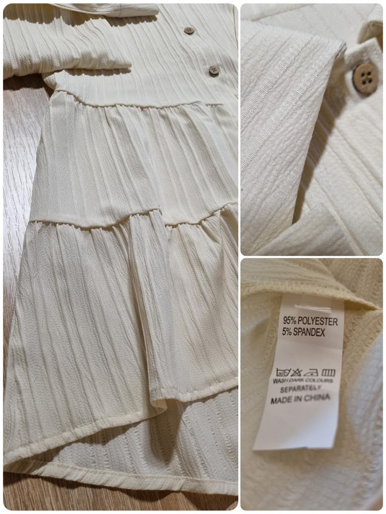 Удлиненная женская рубашка в стиле блузы-туники, выполненная в светлом, кремовом (айвори/экрю) оттенке. 🔸На выбор множество расцветок, размеры: S-3XL. - Замеры изделия М: Длина - 71 см ОГ - 100 см Ширина плеч - 39 см Длина рукава - 63 см Особенности и крой: 🔸Материал/Фактура: Ткань имеет выраженную вертикальную жатую текстуру, которая придает изделию объем и динамичность. 🔸Силуэт: Рубашка имеет расклешенный, свободный крой "бэби-долл". Расширение начинается под грудью и продолжается несколькими широкими воланами. 🔸Детали: Классический рубашечный воротник и центральная планка с пуговицами. Пуговицы выполнены под дерево, что добавляет мягкий, натуральный контраст. Длинные рукава с манжетами на пуговицах. 🔸Длина: Удлиненная, закрывающая бедра, что позволяет носить ее как тунику. 🔸Общее впечатление: Романтичная, женственная модель, сочетающая классические элементы рубашки с модным ярусным кроем, что делает ее идеальной для создания нежного и комфортного образа. Рекомендую 👍 Ставлю ⭐⭐⭐⭐⭐ Спасибо продавцу ❤️ и Joom ❤️