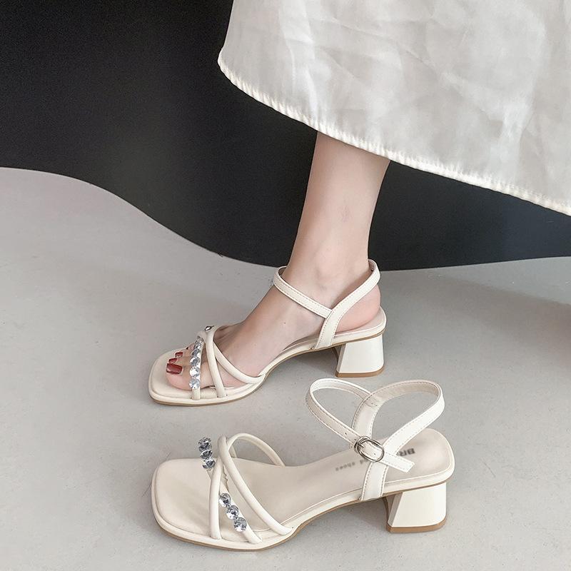 Серебристые туфли-сандалии на толстом каблуке женские новые летние юбочные темпераментные туфли на высоком каблуке со стразами пляжные туфли