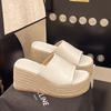 Крутые шлепанцы на танкетке, женские, новая летняя мода, на толстой подошве, универсальные, маленькие шлепанцы из соломы на одном ремешке