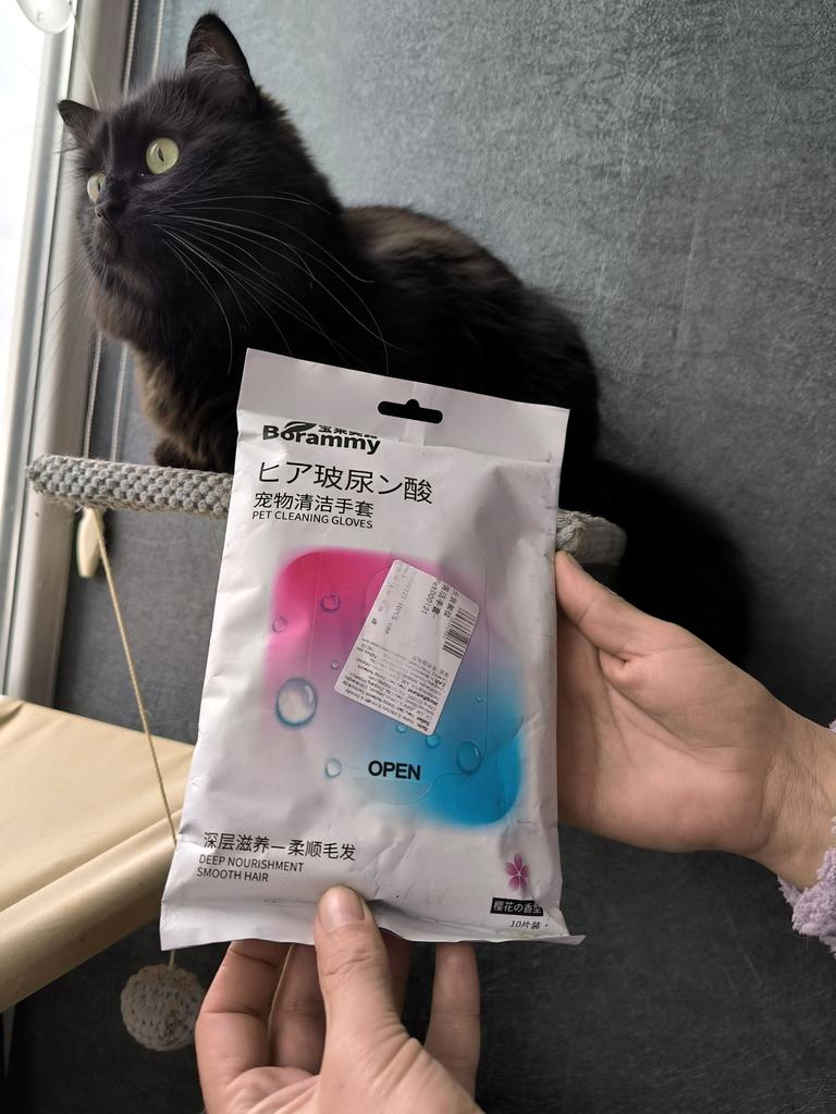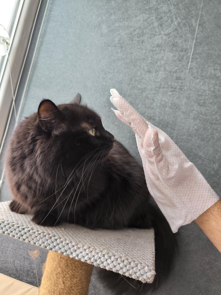 Одноразовые перчатки Borammy для мытья домашних животных. Очищают, дезодорируют и массируют без необходимости смывания водой. Подходят для собак, кошек и других животных. Безопасны для кожи и содержат гиалуроновую кислоту. Упаковка содержит 10 штук. Перчатки очень влажные. Специальный раствор буквально капает с них. Запах приятный,не химозный. Кошка не пыталась убежать,с удовольствием принимала процедуру. Очень интересный и для меня новый продукт. Будет применять и на собаках ,особенно после прогулок👍 Рекомендую.