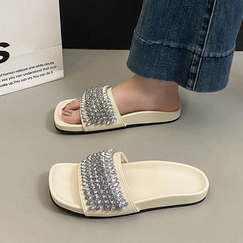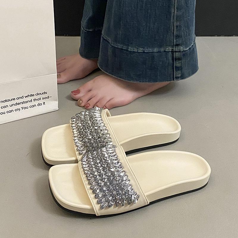 New summer rhinestone fashion outer wear casual open-toe one-word buckle sandals flat-soled cool slippers women