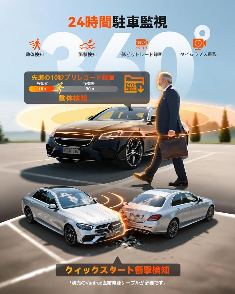 [Мониторинг парковки в 4 режимах для круглосуточного спокойствия с всенаправленной защитой] Оснащен четырьмя режимами: обнаружение движения с предварительной записью, энергосберегающее обнаружение ударов с использованием G-сенсора и экономящая место замедленная запись и запись с низким битрейтом. Функция предварительной записи позволяет записывать 10 секунд до события, фиксируя все ранние признаки вандализма, выбивания двери и ДТП.. Кроме того, вы можете отрегулировать дальность обнаружения, чтобы значительно уменьшить количество случайных записей, вызванных шелестом листьев или прохожими, а также сократить расход места на SD-карте.. Благодаря всенаправленной записи на 360° с четырех камер вы можете следить за своим автомобилем 24/7, как на парковке, так и во время движения.. (Требуется отдельный кабель прямого питания (КАК В: B094882TJC) продано отдельно.)