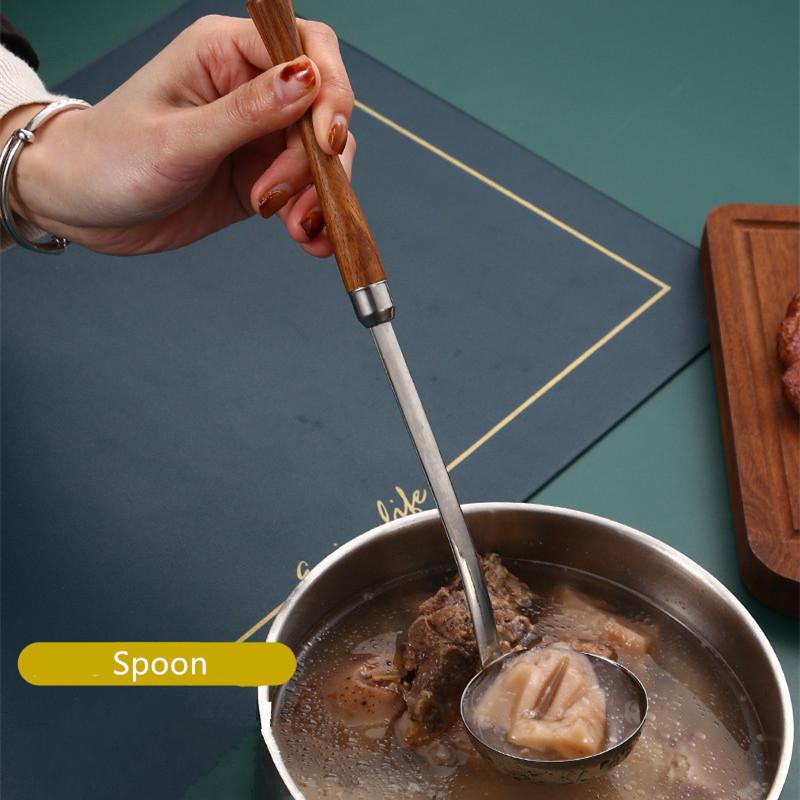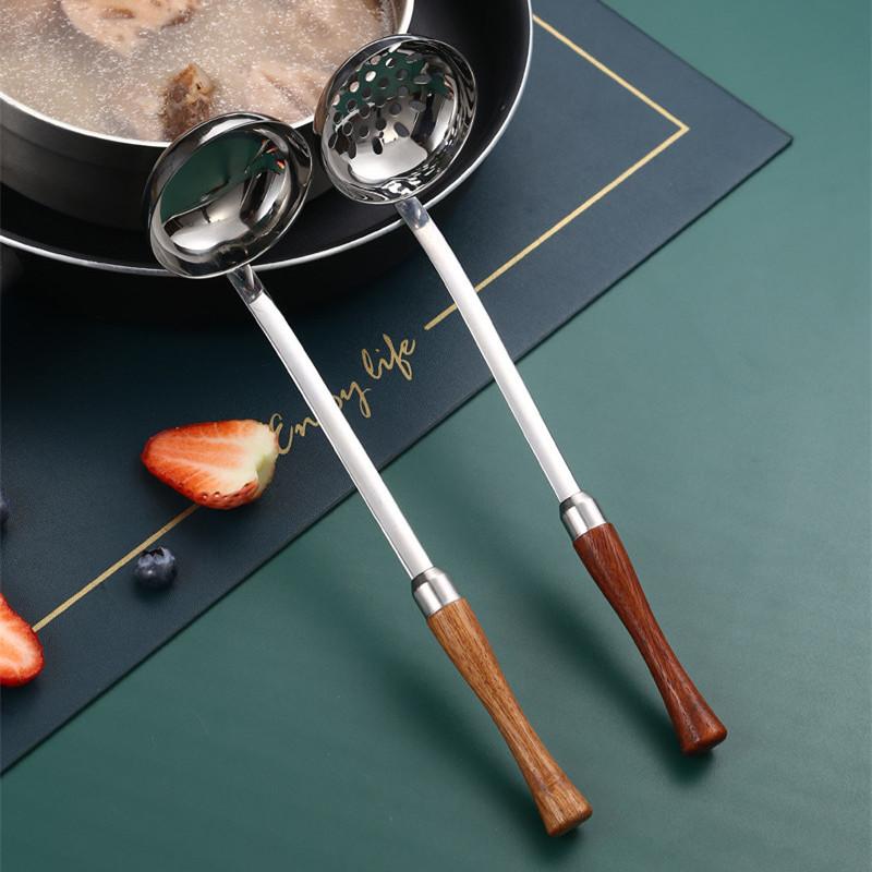 Скиммер с длинной деревянной ручкой, суповая ложка, половник, сервировочные столовые ложки, посуда из нержавеющей стали, кухонные принадлежности, все с бесплатной доставкой
