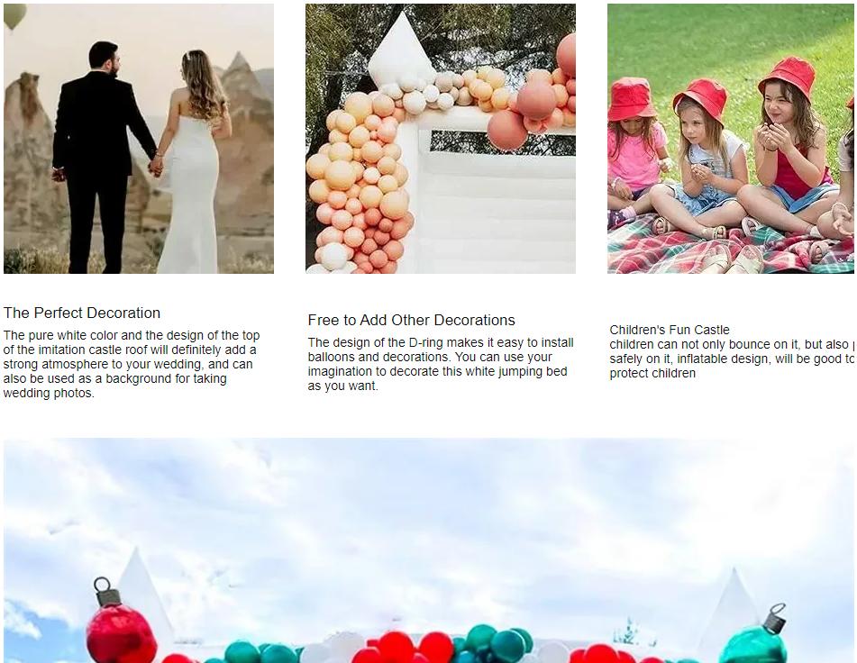 Товары для отдыха: Охватывая основные европейские праздничные украшения для Рождества, Нового года, Пасхи и других, включая белые подвесные украшения в виде замков, наклейки-снежинки и разноцветные гирлянды, все изготовленные из не имеющих запаха, экологически чистых материалов, идеально дополняют теплую атмосферу праздничных событий. Свадебные принадлежности: Свадебный декоративный набор в белой тематике — включая направляющие в форме замка, аксессуары для арки из воздушных шаров, скатерти и посуду — соответствует обстановке белого замка, создавая чистую и романтичную атмосферу.. Подходит для свадеб на открытом воздухе на лужайке или тематических свадеб в помещении.